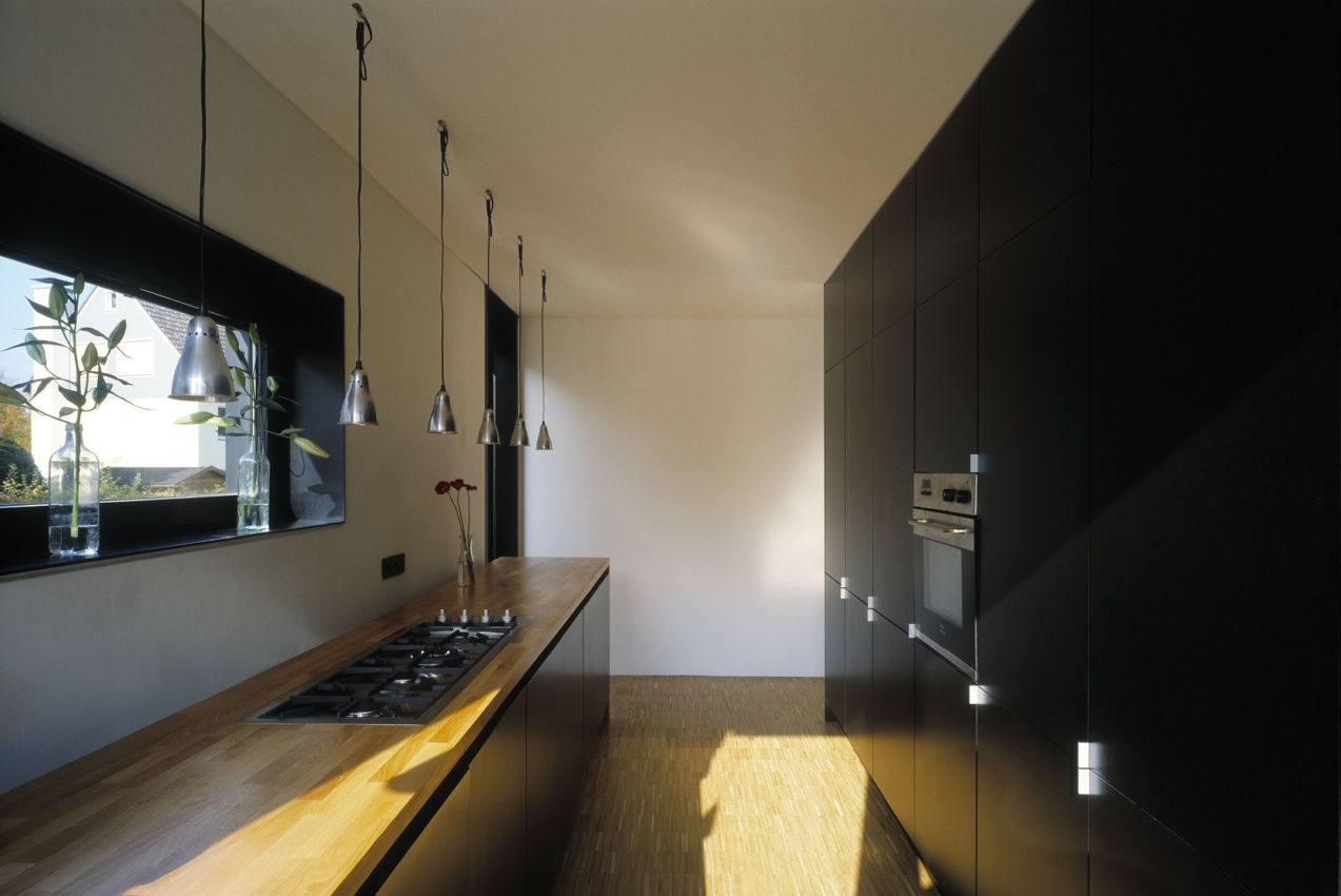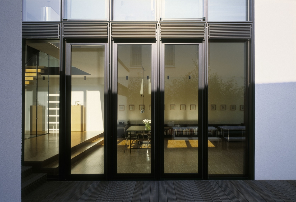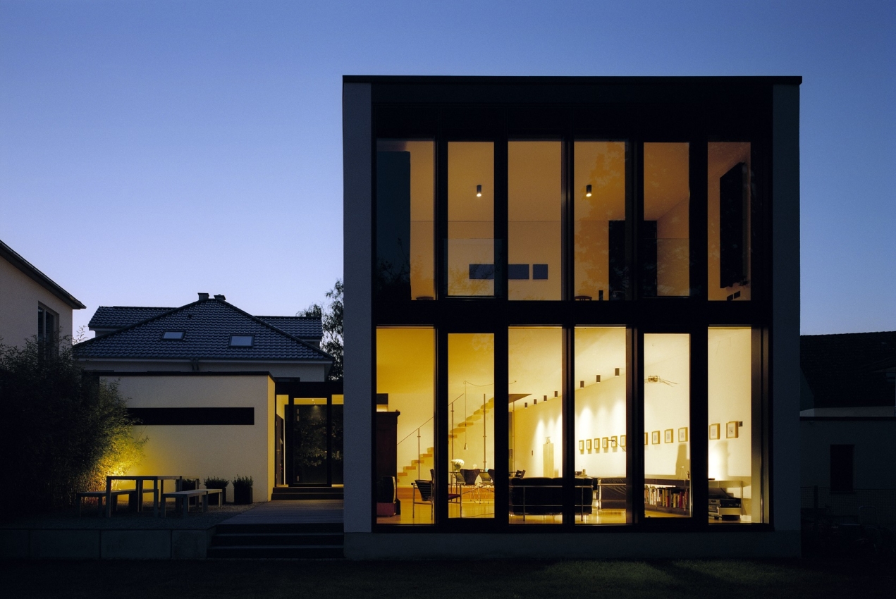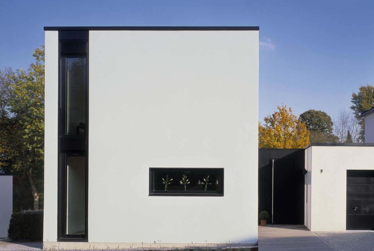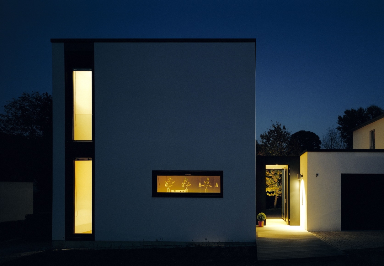 The three brick exterior walls, which are set against the glass surfaces as white plastered panes, are constructed as 36.5 cm thick single-skin poroton masonry, so that a costly and climatically unfavorable thermal insulation composite system can be dispensed with.