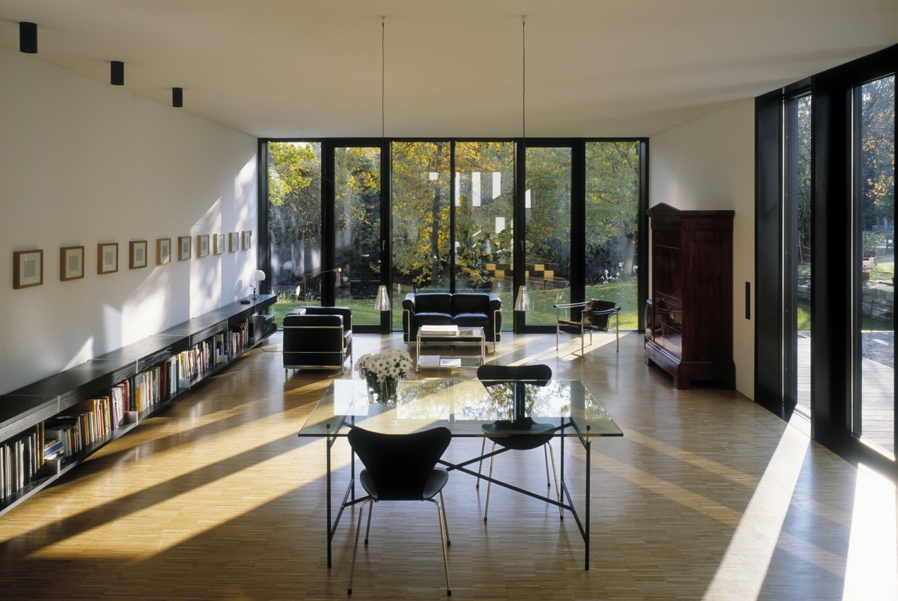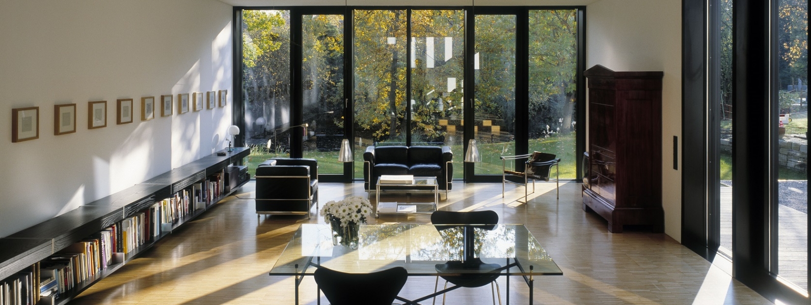 Inside the house, all rooms face either south or the lake to the east and open up to the outside with large windows. Behind the window grid, which is always the same, there are slender steel supports on each axis in the form of rectangular profiles just four centimeters wide.
