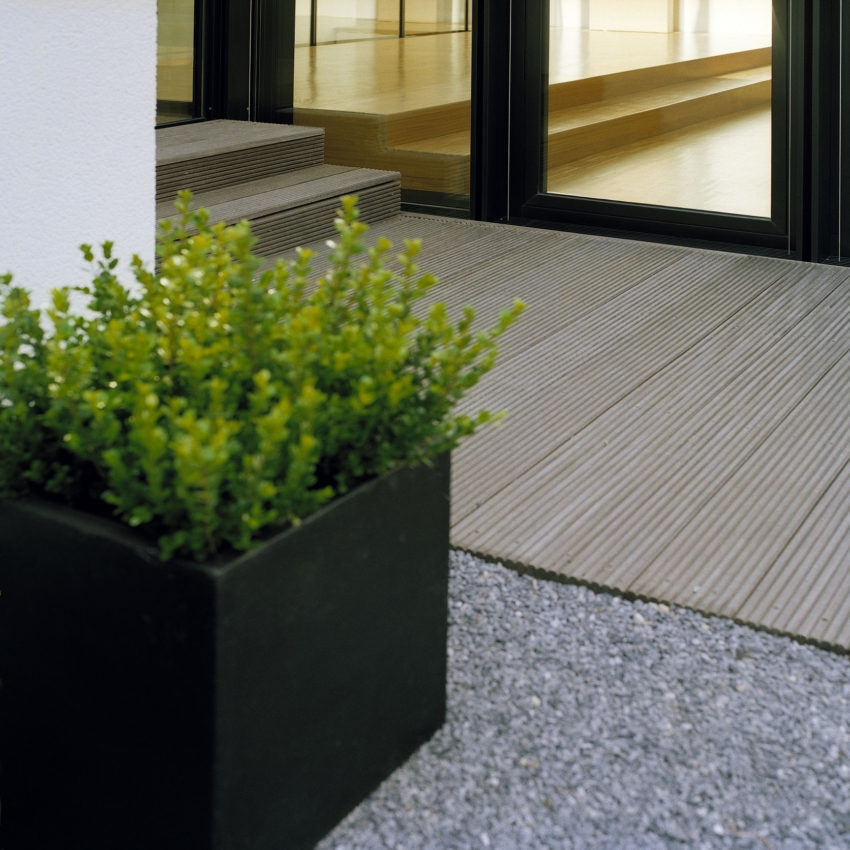 The structures of the south-facing main house and the garage form the entrance in their joint, whose continuous wooden deck extends into the garden by the lake.