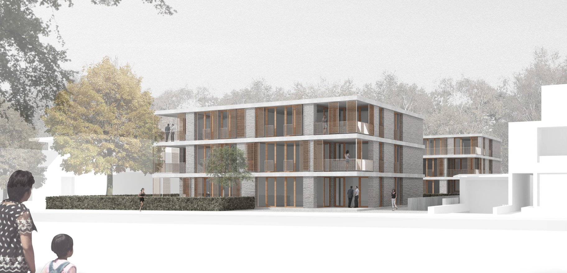 Floor-to-ceiling windows divide the building into floor-to-ceiling wall sections with facing brickwork and transparent openings. The storeys appear on the outside via projecting cornices, thus emphasizing the structural clarity of horizontal and vertical panes. Sliding shutters running in front of the façade quote the typical local element of window shutters and contribute to the liveliness of the buildings.