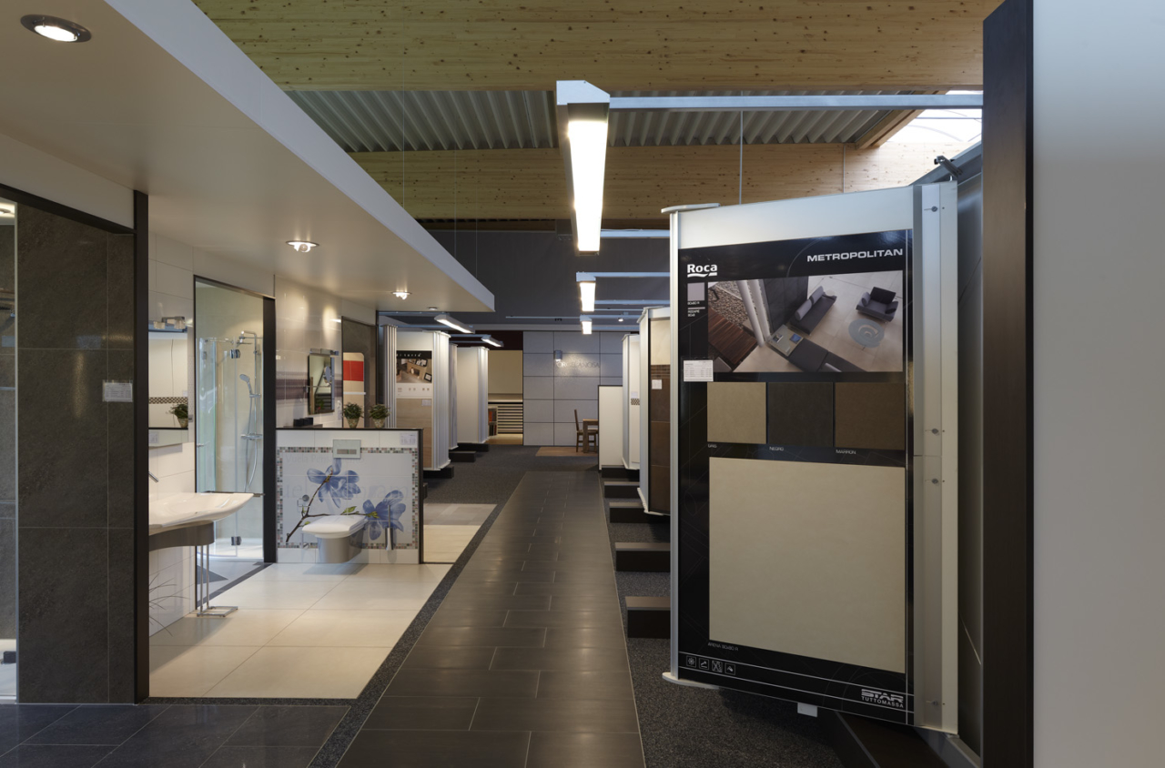 The focal point of the building in Würselen is the approx. 800 m² sales and consultation room, which contains the spacious tile and natural stone exhibition.