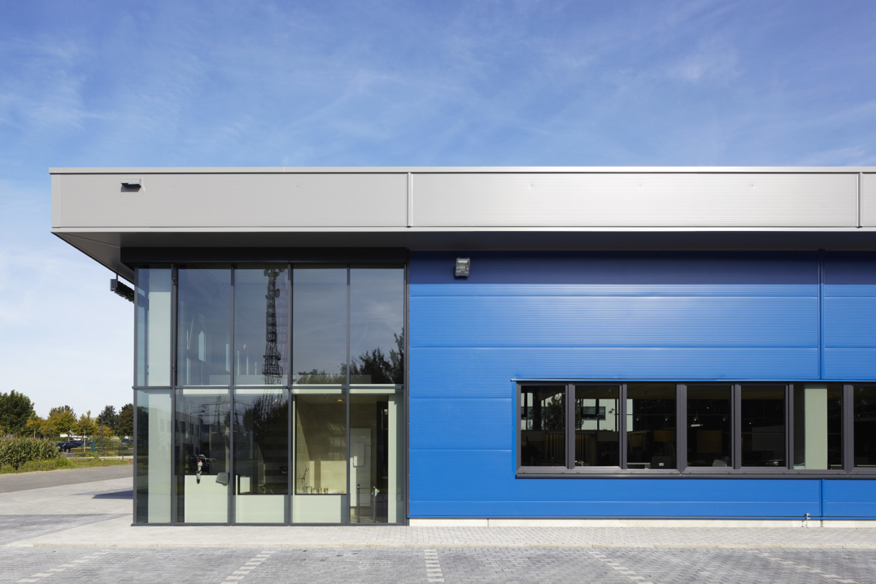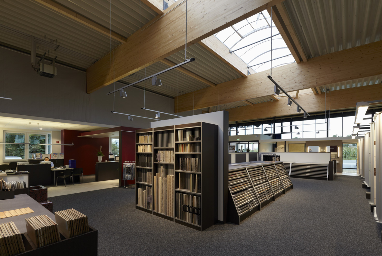The six-meter-high room is bright and friendly and conveys the company’s expertise. The sales area is adjoined by approx. 900 m² of storage space and a 350 m² loading zone.