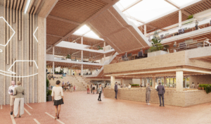 The third floor offers communal uses such as relaxation rooms, a gym, a bar and a further co-working space with an adjoining conservatory as an extension area. The extensive green roof is accessible and usable via a roof terrace. All areas are barrier-free. It goes without saying that we attach great importance to sustainability, environmentally friendly construction and the responsible use of resources. The supporting structure and interior fittings of the company headquarters are largely made of wood, and the use of sustainable, recycled materials is a top priority. Solar cells are installed on the façade and roof to generate energy. This design helps to save weight and material, which significantly reduces CO2 emissions. The green roofs and the creation of a public climatic forest support the microclimate and serve as a water reservoir in the city.
