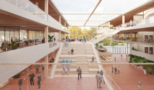 A central feature of our design is the open atrium structure, which is located in the core of the building and leads upwards through an inviting staircase landscape. The glazed roof allows daylight to stream into this atrium and gives each storey its own shape and vibrancy, creating strong meeting points and visual relationships. The quieter work areas are placed on the outside, while the supporting structure and the core structure with the staircase serve as stable elements and can adapt the modular interior architecture to changing requirements in an agile manner.