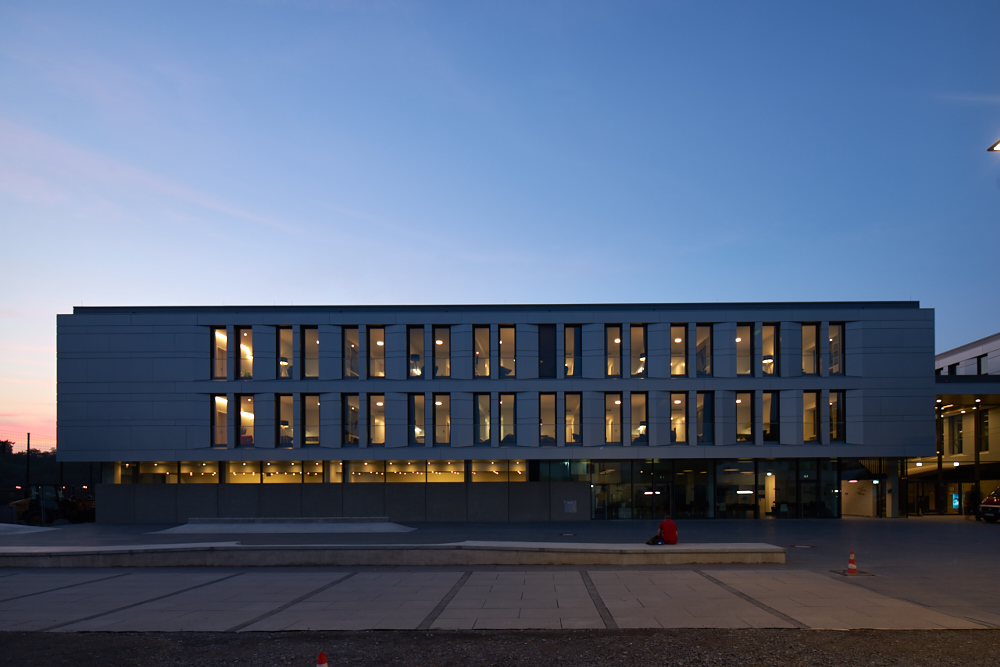 In the spirit of corporate architecture, the building develops a clear architectural stance. The individual silver structures hover sharply above the concrete slabs of the first floor. The innovative and technical-looking metal façade made of folded aluminum cassettes reflects the club’s high standards for itself and its athletes. The icon of the red bull in the tilted façade field on the square adds dynamism and power to this claim.