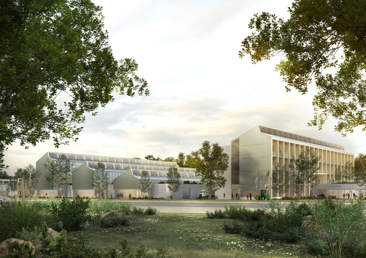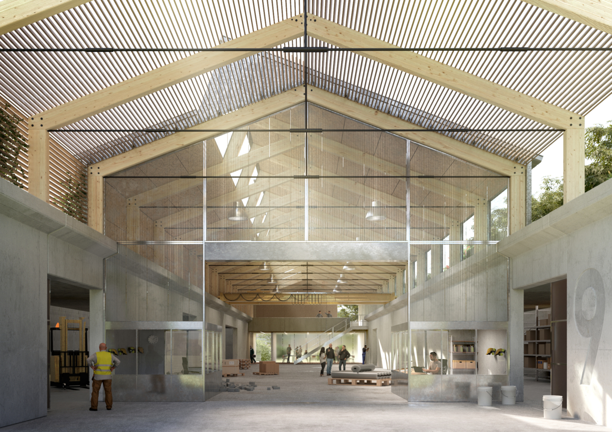 The base of the campus consists of low-maintenance, heavy-duty exposed concrete elements. The large hall areas will be covered by a roof supported by glulam trusses, the height of which is adapted to the respective purpose and space requirements. A light strip incorporated into the shape of the roof facing north-west is intended to ensure sufficient lighting and natural ventilation, while the south-east side of the roof is used for the installation of PV modules. In addition, the roof surfaces of the smaller service areas will be equipped with intensive green roofs.