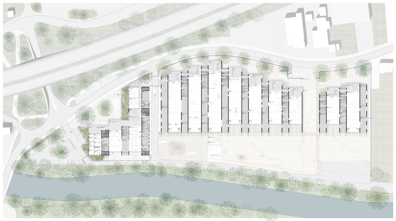 Along the adjoining road to the north, the linear structures are offset and aligned with the existing buildings. In addition to the row of pavilions, the dormitory is planned on the western side, which will form a striking address due to its higher storeys. The building façades have a different appearance depending on their orientation: facing the street, the building design has a representative and closed façade. The open façade gives the south-facing open space an industrial character and provides access for machines, delivery traffic for the supply of materials and the transportation of tests and prototypes.