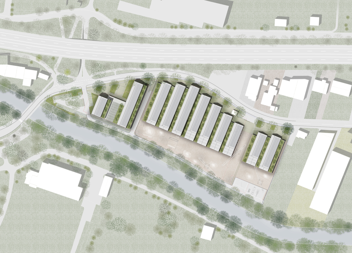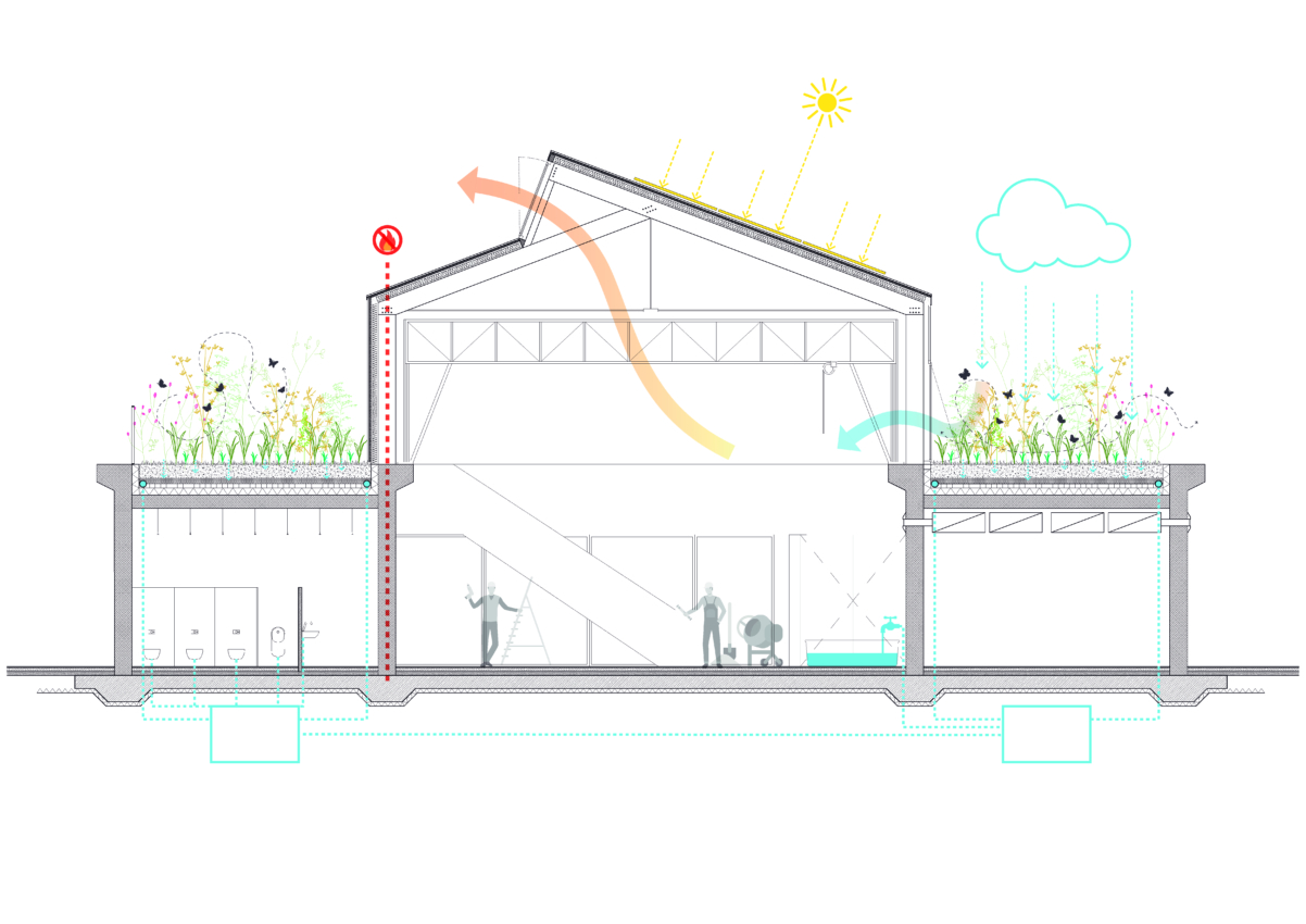 In addition to the construction of a green roof and the generation of renewable energies, the modular construction of our design proposal in particular ensures a high level of climate compatibility, as restructuring and even dismantling work can be carried out easily.
