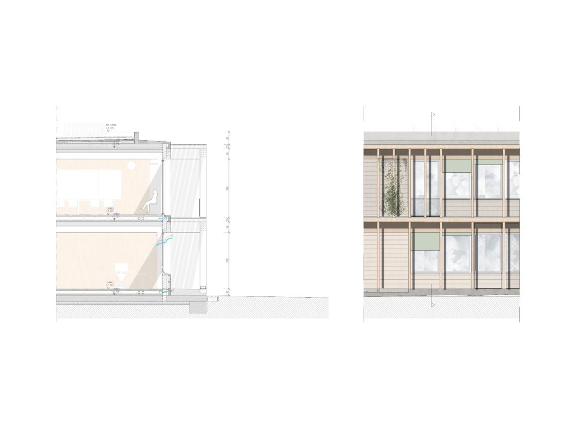 The school building is supported by a timber construction, which characterizes the design of the façade and the interior. The choice of construction material and the high degree of prefabrication of the wall, ceiling and façade elements ensure that the building is highly climate-compatible. Closed façade elements are clad with larch wood, while the balcony areas in front are fitted with fall protection in the form of metal netting, which also serves as a climbing aid for the façade greenery.