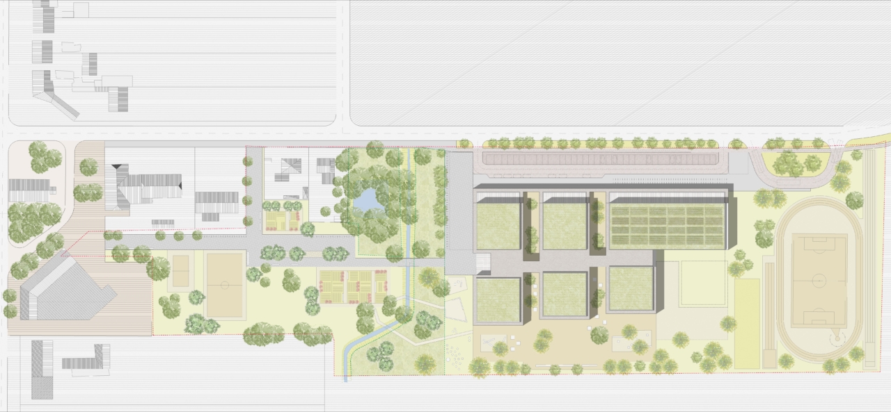 The central axis is formed by an internal school street, which is extended towards the historic village church and thus links up with the existing surrounding buildings. In addition to its access function, Schulstrasse also serves as a meeting place and offers the opportunity for social and educational activities.