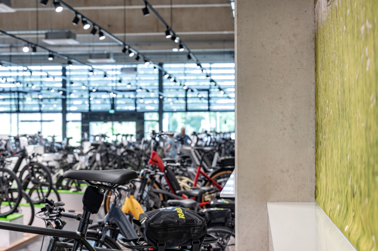 En cambio, el nuevo y moderno edificio de Rümelswiese presenta un diseño generoso. La planificación de SHA Scheffler Helbich Architekten ha creado un mundo eficiente centrado en las dos ruedas, especialmente diseñado para satisfacer las necesidades de clientes y consumidores. Las áreas de montaje de bicicletas nuevas y de reparación y mantenimiento están separadas entre sí para que los procesos de trabajo puedan estructurarse de forma óptima. Por ejemplo, la zona de recepción de bicicletas con tres puestos de trabajo tiene su propia entrada y caja, para que los clientes puedan ser atendidos rápidamente.