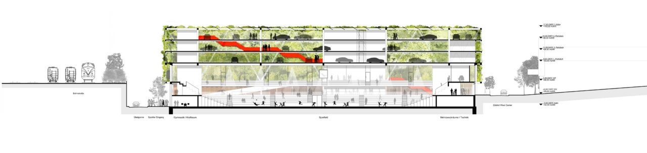 Las plazas de aparcamiento requeridas se situarán en tres plantas por encima del pabellón deportivo. «Las plantas del aparcamiento abarcan el cuerpo del pabellón y confieren a todo el edificio su inconfundible forma compacta», afirma Horstmeier. Si estas zonas dejaran de ser necesarias a largo plazo debido a la disminución del transporte privado, los tres niveles de aparcamiento podrían convertirse en zonas deportivas públicas, áreas para la jardinería urbana y la acuaponía o incluso utilizarse como espacio para vivir y trabajar en el centro de la ciudad.