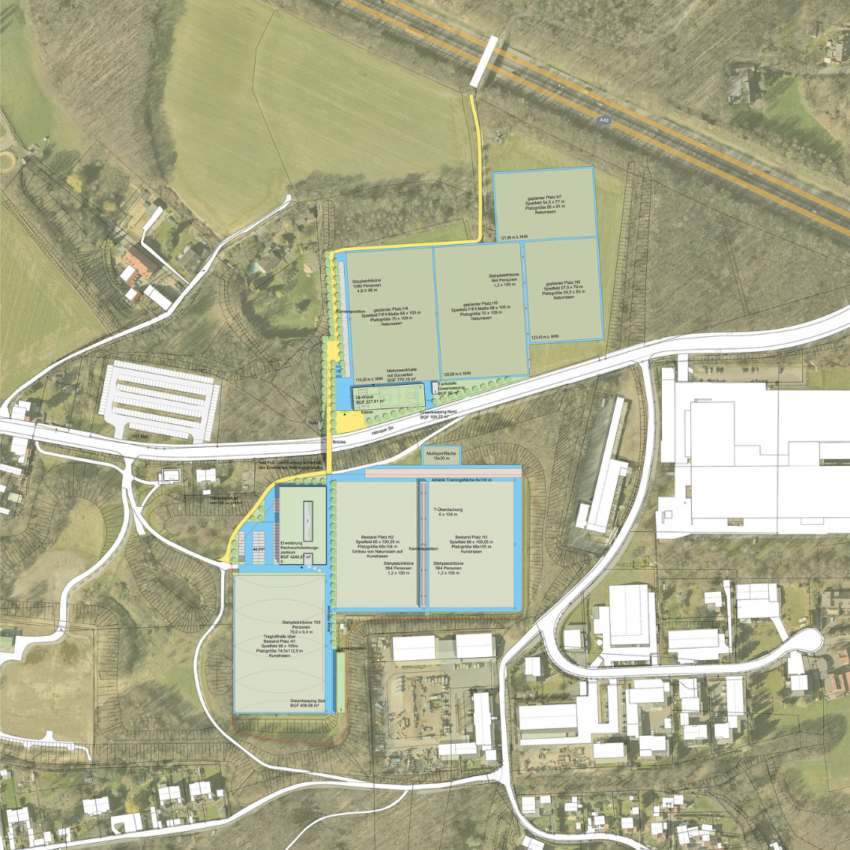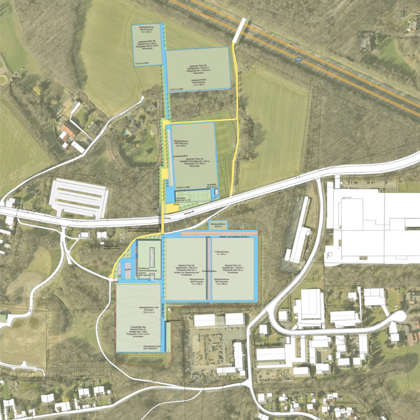 L’actuel centre de talent du VfL sera agrandi afin que les jeunes joueurs et autres membres du personnel du club puissent disposer de cabines et d’espaces de détente, mais aussi de salles d’entraînement et de possibilités d’hébergement. Les espaces de stationnement existants seront également agrandis pour répondre à l’augmentation des besoins de stationnement. Des terrains en gazon naturel au nord de la Hiltroper Straße complètent les terrains de football existants au sud. Les machines et les ustensiles nécessaires à l’entretien des pelouses peuvent être abrités dans un nouveau bâtiment de greenkeeping à construire à proximité immédiate des terrains de sport. Les terrains de football existants et nouveaux seront complétés par trois tribunes couvertes, permettant aux spectateurs d’assister aux entraînements et aux compétitions à l’abri des intempéries.