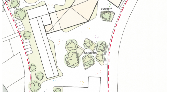 La construction de l’extension de l’école, de l’association de musique et de la maison commune du village offre la possibilité de restructurer et de différencier l’adresse et de renforcer l’identité du village. Le projet s’intègre naturellement dans les structures existantes, réagit directement à son environnement et crée en outre des espaces libres bien définis.
