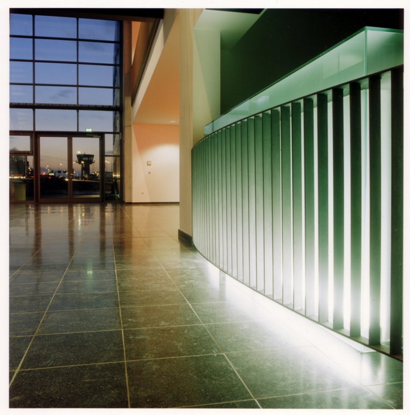 Les deux longues et élégantes barres de bâtiment expriment la logique interne de deux unités d’utilisation indépendantes. Ils flanquent le hall d’entrée vitré comme un geste d’accueil généreux et représentatif, à partir duquel les visiteurs se répartissent à droite et à gauche dans les zones administratives « Aéroport » et « Cargo ». Dès l’entrée dans le hall aéré et lumineux, qui constitue le centre identitaire en tant qu’espace de communication commun, les deux vitres des barres de bureaux orientent le regard du visiteur de manière axiale vers la tour de l’aéroport, symbole architectural de l’aéroport.