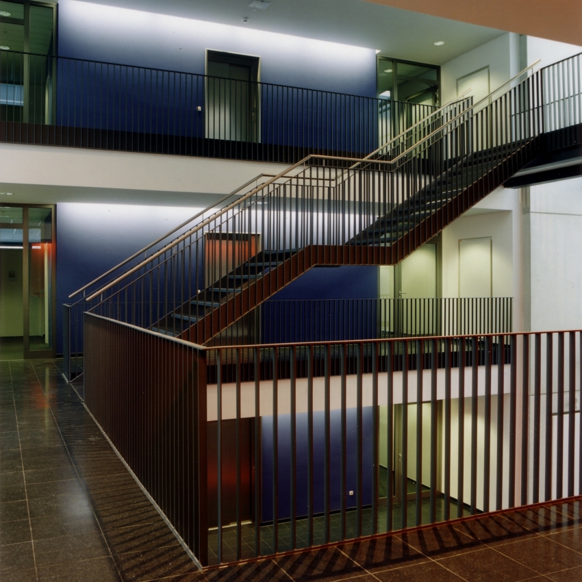 Le hall et la barre d’immeuble forment un ensemble commun dans leur configuration spatiale et sont en même temps le résultat d’un concept économique. Grâce à une utilisation optimisée de la surface au niveau des deux ailes de bureaux et à la réduction simple et ingénieuse de deux bâtiments à une adresse d’entrée commune, celle-ci peut être réalisée de manière généreuse et particulièrement représentative.