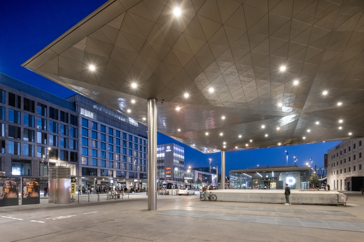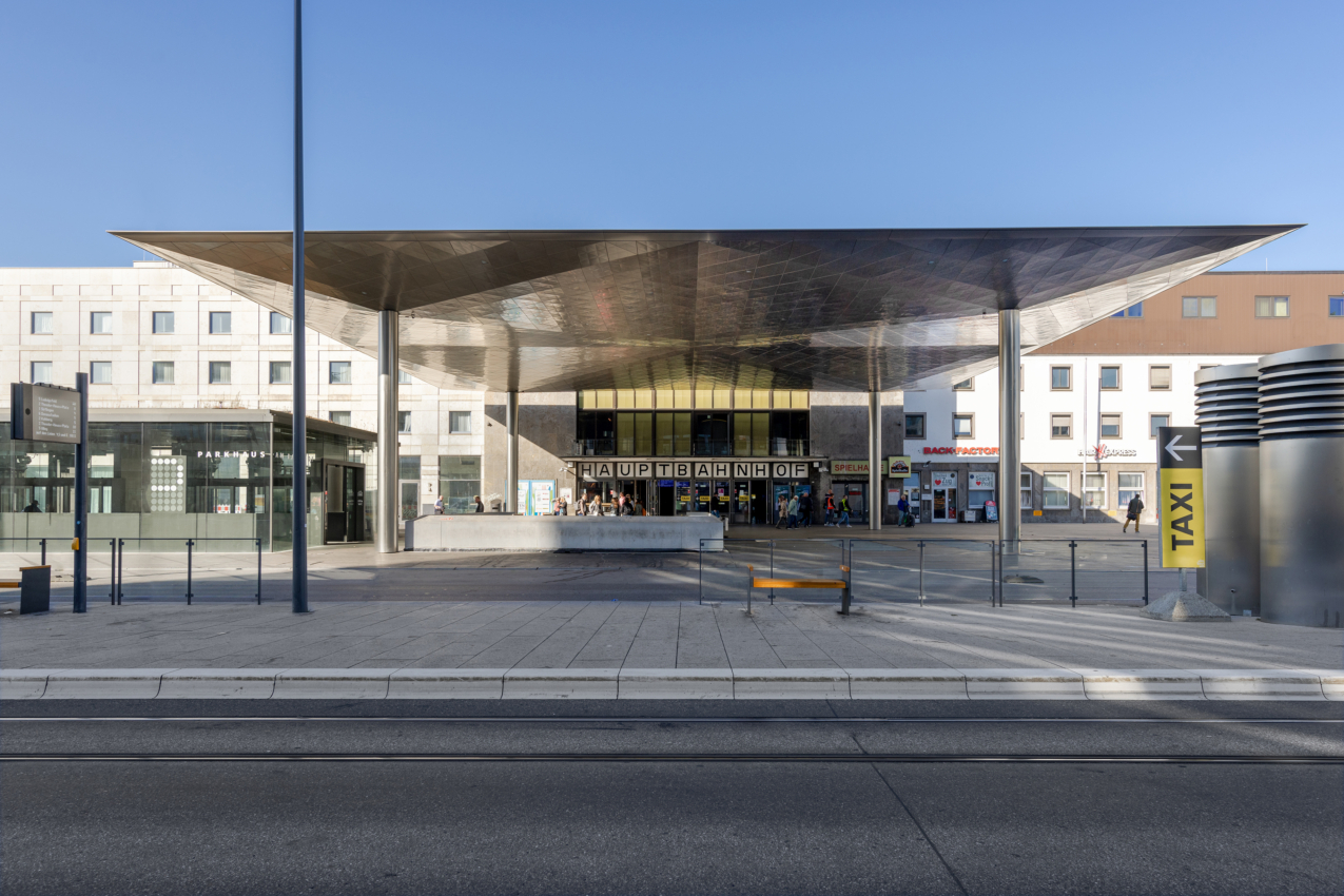 Mit einer Grundfläche von ca. 770 m² stellt das neue Bahnhofsvordach einerseits den regengeschützten Übergang zwischen den einzelnen Verkehrsfunktionen sicher und erfüllt gleichzeitig eine Foyerfunktion für den Bahnhof und den Bahnhofplatz. Vier Rundstützen tragen die allseitig auskragende, filigrane, geometrische Dachfläche, die aus jeweils 16 ober- und unterseitig gefalteten Teilflächen besteht. Zwei weitere langgestreckte Überdachungen überspannen die Haltestellenbereiche auf dem Bahnhofsvorplatz. Sie gleichen in ihrer Gestaltung dem großen Dach vor dem Bahnhof, bestehen aber aus sechs bzw. sieben quadratischen, aneinandergereihten Schirmen.
