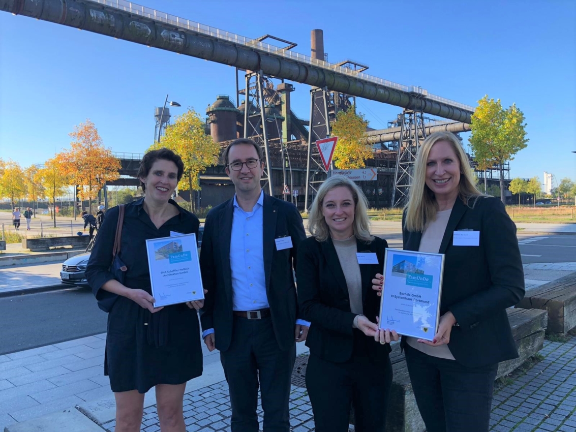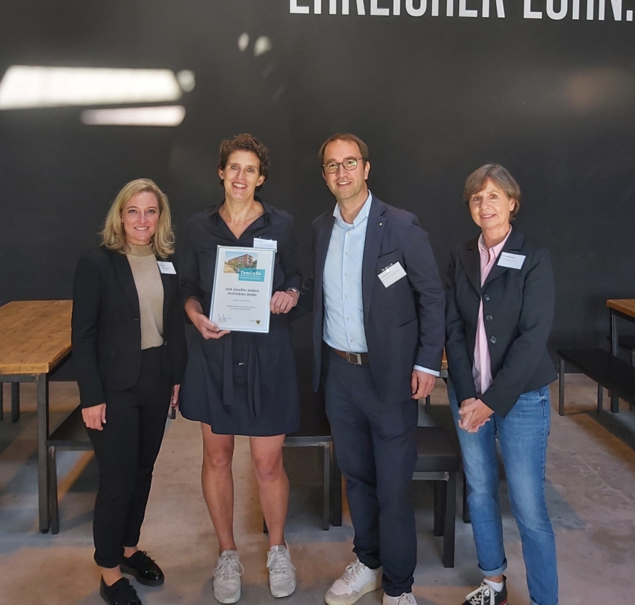 “FamUnDo ” – het acroniem staat voor “gezinsbewuste bedrijven in Dortmund”. Het project van de Dortmund Economic Development Agency laat bedrijven specifieke manieren zien waarop ze hun werknemers kunnen helpen om een beter evenwicht tussen werk en privéleven te bereiken. SHA Scheffler Helbich Architekten GmbH heeft met succes deelgenomen aan de zevende overlegronde. Birgit en Christoph Helbich waren erg blij met de oorkonde.
