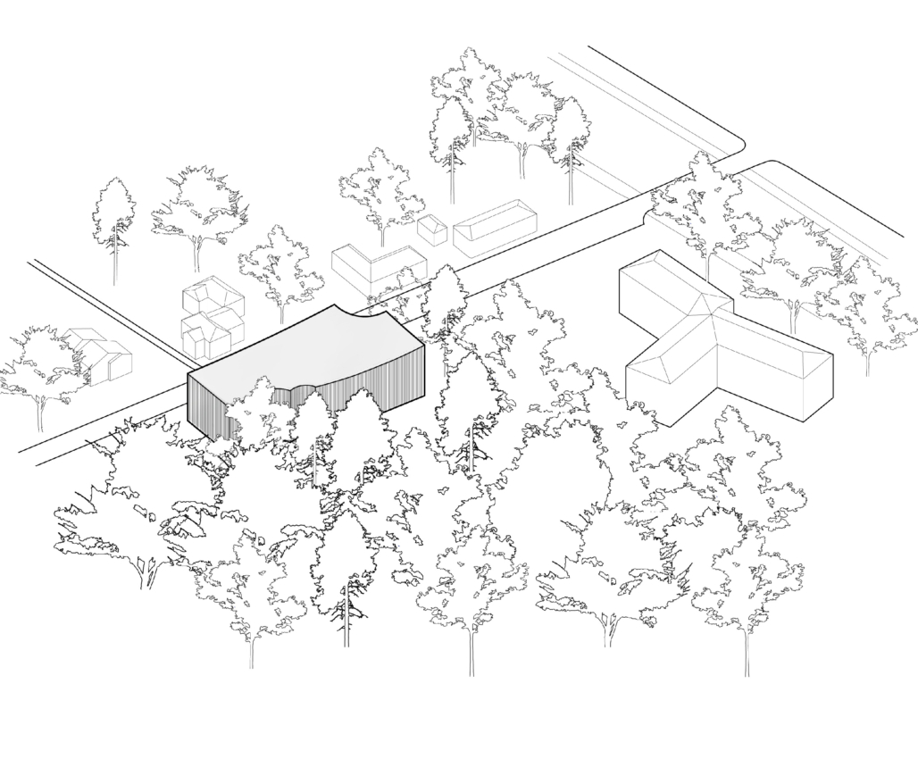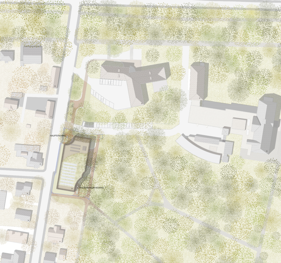 Naast het gebouw zelf, houdt ons ontwerp ook rekening met de omliggende buitenruimtes. Een nieuw pad verbindt het gebouw met bestaande paden, en er zijn ook nieuwe paden en pleinen gepland in het bestaande bomenpark. De open ruimtes worden aangevuld door een wilde bloemenweide, die een waardevolle habitat biedt voor vogels en insecten.