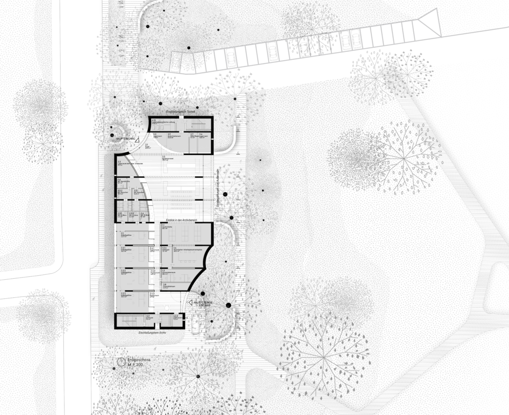 Gevormd door de omringende bomen past het drie verdiepingen tellende ontwerp voor het archiefgebouw in Bad Arolsen met zijn gedenkwaardige gebouwvorm in de stedelijke en natuurlijke omgeving. De vorm is gebaseerd op een solide en rechthoekig volume dat zich van de omringende boomtoppen terugtrekt, zodat ze genoeg ruimte hebben om te groeien. Geprefabriceerde elementen van aangestampte aarde en smalle raamopeningen, waarachter de archiefruimtes zich bevinden, karakteriseren het gevelbeeld. Een transparante begane grond biedt uitzicht op de openbaar toegankelijke ruimtes, die gebruikt kunnen worden voor tentoonstellingen en evenementen.