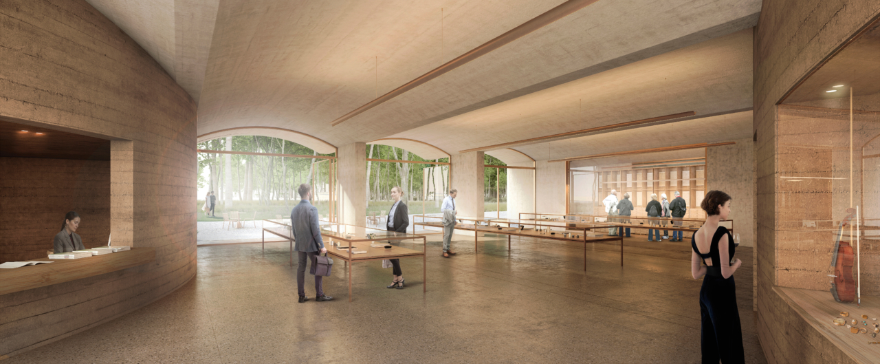 Zichtbare tongewelfde plafonds kenmerken het interieur. Ze organiseren de binnenruimtes en brengen de gebogen designtaal van het gebouw over naar het interieur.