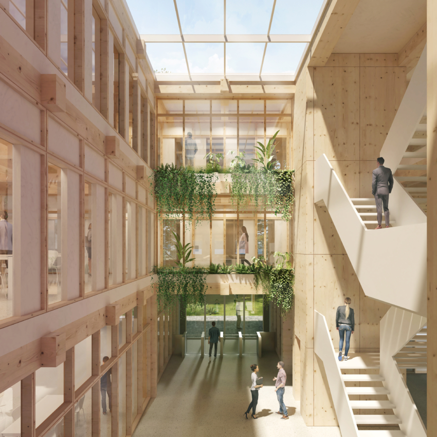 De plattegronden van de bovenste kantoorverdiepingen kunnen in onze bijdrage flexibel worden geconfigureerd en worden alleen onderverdeeld door de toegangskernen. Gelijmde gelamineerde houten balken met massief houten plafonds overspannen het gebouw, waardoor er geen kolommen nodig zijn tussen de gevel en de atria. Open, aangepaste plattegronden zijn dus altijd mogelijk, afhankelijk van de vereisten.