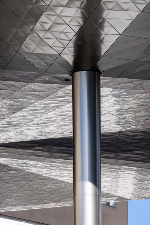 Zowel de steunen als de metalen oppervlakken van de boven- en onderkant van het dak zijn bekleed met roestvrijstalen platen in een zachtgouden kleur. Deze platen krijgen een speciale afwerking en een nanocoating met een zelfreinigend effect.