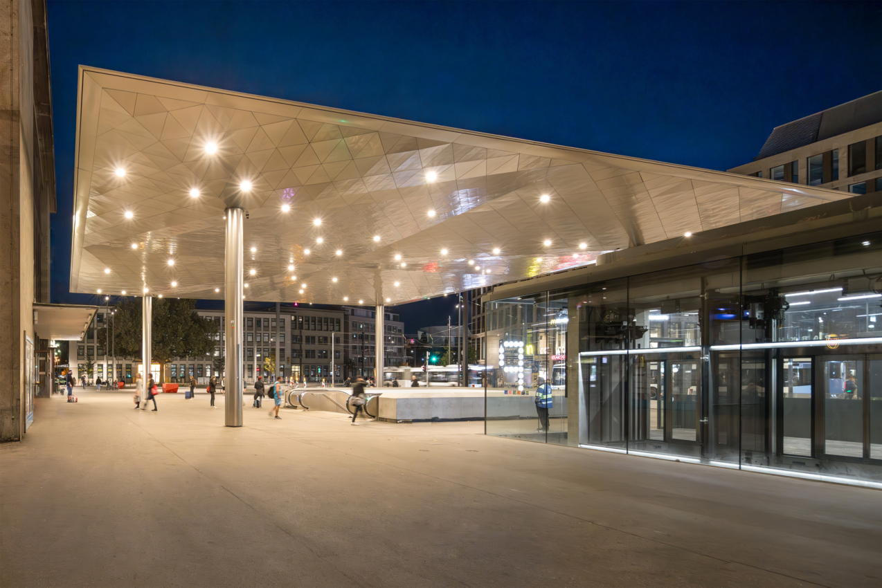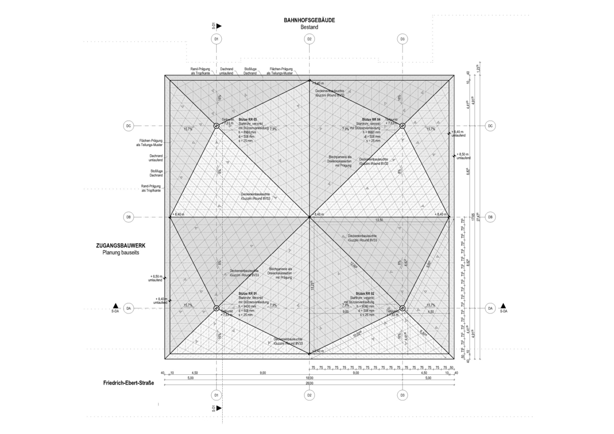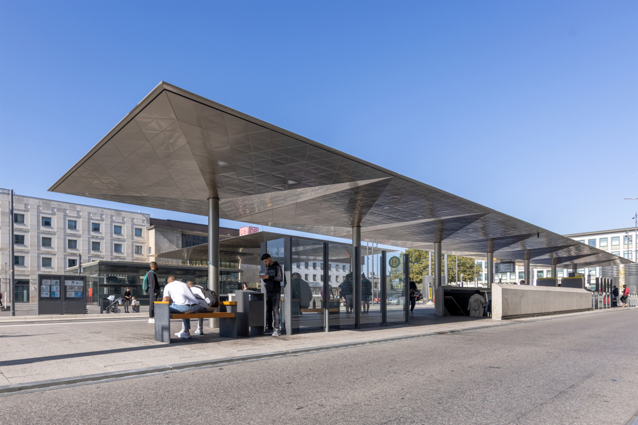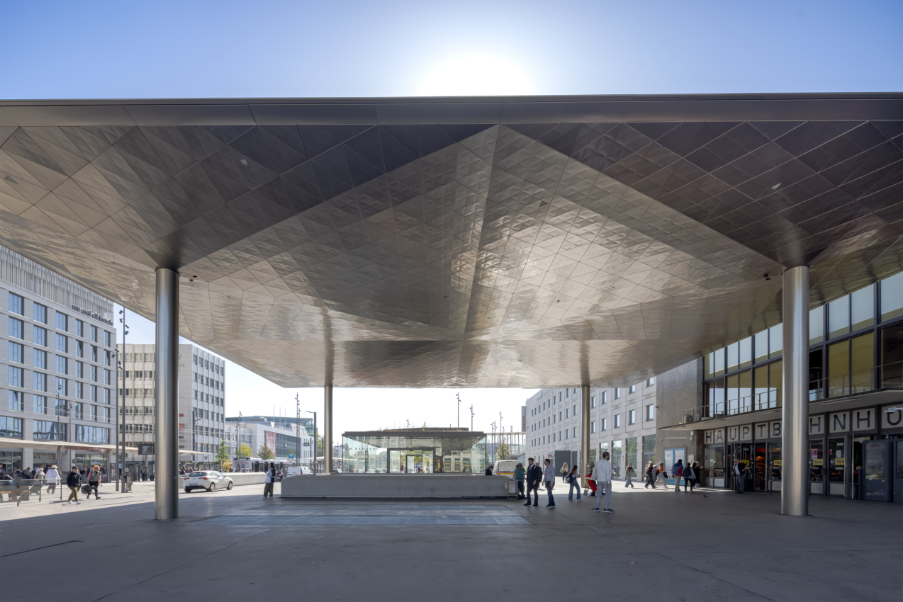 De dakstructuur bestaat uit vier ronde kolommen in een bijna vierkante opstelling, die een filigraan, geometrisch dakvlak ondersteunen dat aan alle kanten uitsteekt en aan de boven- en onderkant uit 16 gevouwen delen bestaat. De afstand tussen het bovenste en onderste oppervlak is het grootst boven de kolomassen op ongeveer 1,75 m, terwijl de afstand tot het midden en de rand van het dakoppervlak tot nul is gereduceerd. De vrije hoogte onder het dak van minstens 6,5 meter neemt in de richting van de straat toe door het schuine stationsvoorplein. De maximale hoogte van het dak boven de steunen is gemiddeld ongeveer 8,65 meter boven de grond.