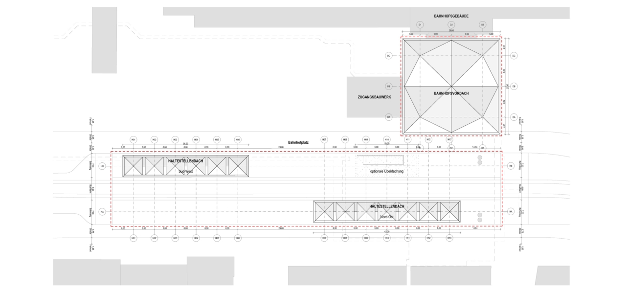 Het nieuwe dak met een dakrandhoogte van ca. 8 m, een randlengte van ca. 28 x 27,5 m en een vloeroppervlak van ca. 770 m² moet enerzijds zorgen voor een regenvrije overgang tussen de afzonderlijke verkeersfuncties en tegelijkertijd een foyerfunctie vervullen voor het station en het stationsplein. In termen van stadsplanning markeert het een ruimtelijk brandpunt van het stationsplein.