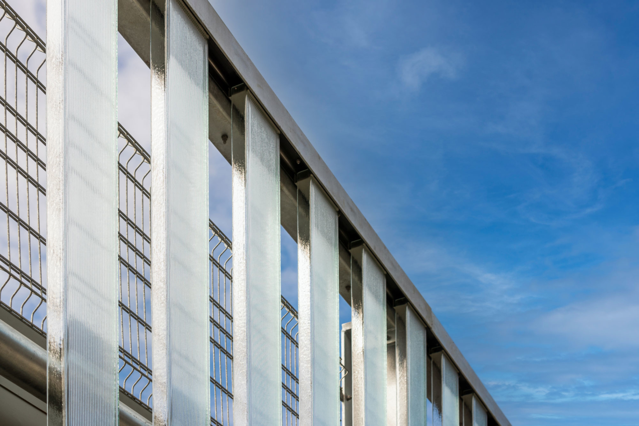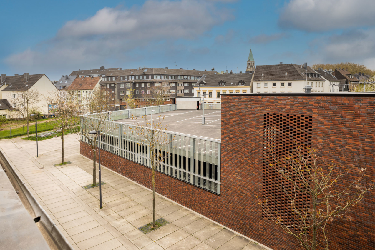 De hoofddraagconstructie van de parkeergarage is een stalen skeletconstructie. De twee trappenhuizen werden gebouwd in gewapend beton. Van buiten maakt de parkeergarage indruk door de combinatie van een geperforeerde gevel van klinkers – een filtermetselwerk – met geprofileerde glazen elementen. Door af te wisselen tussen open en gesloten geveldelen kan voor natuurlijke en noodzakelijke ventilatie worden gezorgd. Hierdoor was het mogelijk om af te zien van een apart ventilatiesysteem; de parkeergarage voldoet dus aan de eisen voor een grote open parkeergarage. De lage hoogte en de helling aan de oostkant vormen de overgang naar de naburige gebouwen langs de Hochofenstraße in het oosten. Gesloten gevelzijden zorgen voor geluidsisolatie voor de bewoners.