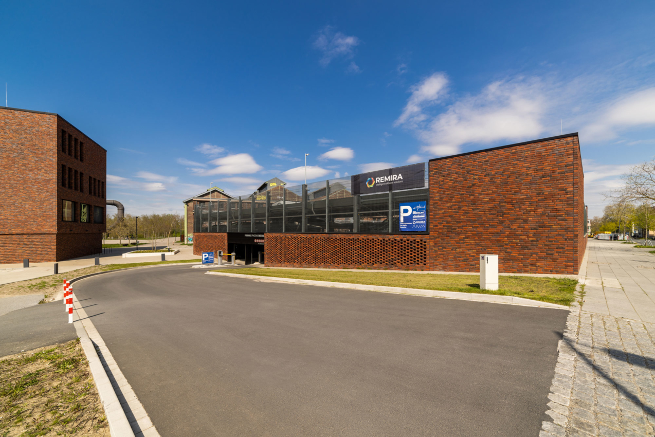 Net als voor het hele ensemble, dat na de toekomstige bouwfasen uiteindelijk uit in totaal vijf gebouwdelen zal bestaan, is het bakstenen materiaal ook in twee opzichten een schakel in de parkeergarage: enerzijds verbindt het materiaal alle gebouwen en de gemeenschappelijke basis tot een homogene, op zichzelf staande eenheid; anderzijds citeert het het industriële erfgoed van de locatie (een voormalig staalfabrieksterrein in het zuiden van Dortmund) zonder het te imiteren. De parkeergarage met meerdere verdiepingen zet dus zowel de architecturale taal als de materialiteit van het hoofdgebouw voort en is daarom een even belangrijk onderdeel van het ensemble. In zijn geheel is dit dan meer dan de som van de afzonderlijke gebouwen voor het publiek en het bedrijf.
