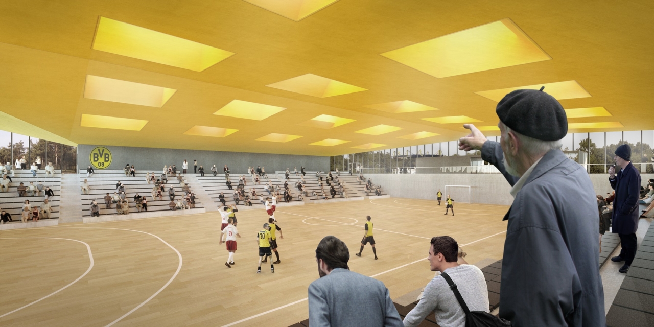 Het belangrijkste functionele doel van het ontwerp is absolute toegankelijkheid en gelijkvloerse toegang tot het gebouw voor alle toeschouwers. Hiervoor wordt de sportvloer in het bestaande terrein ingegraven en wordt de overtollige aarde op het terrein gebruikt om het toekomstige terrein gelijkmatig te modelleren. Het resultaat is een open sportlandschap binnen en buiten het gebouw dat op een speciale manier voldoet aan de vraag van het publiek naar multifunctionaliteit, flexibiliteit en integratie van populaire sporten en sporten voor gehandicapten.