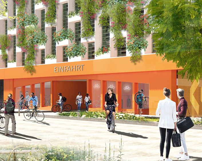 Met dit voorbeeld laten we zien hoe een gebouwconcept extreem duurzaam kan zijn in termen van alle SDG’s. Het grootste onderdeel zijn de oude bomen, die door hun leeftijd en grootte een bijzonder grote hoeveelheid CO2 kunnen binden, maar bovenal zorgen voor een evenwichtig binnenklimaat en natuurlijke bescherming tegen de zon. Parkeergarages worden gebouwd op omgebouwde terreinen en sparen land. Alle open ruimtes zijn zo gepland dat ze waterdoorlatend zijn en het regenwater blijft op het terrein, zodat de buurt gezien kan worden als een belangrijke bouwsteen in termen van de sponsstad. Daarnaast zullen er regenputten worden aangelegd om het gebruik van grijs water voor de sanitaire ruimtes en de irrigatie van de dakoppervlakken te garanderen. Het hoofdgebouw wordt gebouwd als een hybride gebouw, waarvan het ontwerp gebruik maakt van de respectieve voordelen van de overeenkomstige componenten: Een betonnen hoofdstructuur met een hoog aandeel eco- en gerecycled beton wordt gebruikt om brede overspanningen te creëren in de twee onderste verdiepingen. De bovenste verdiepingen maken gebruik van de voordelen van hout als hernieuwbaar bouwmateriaal met zijn lage dode gewicht en de mogelijkheid om alle benodigde ruimtestructuren te maken met kleinere overspanningen. Beide bouwmethoden kunnen volgens het Cradle to Cradle-principe als volledig en ongemengd deconstrueerbaar en recyclebaar worden gerealiseerd.