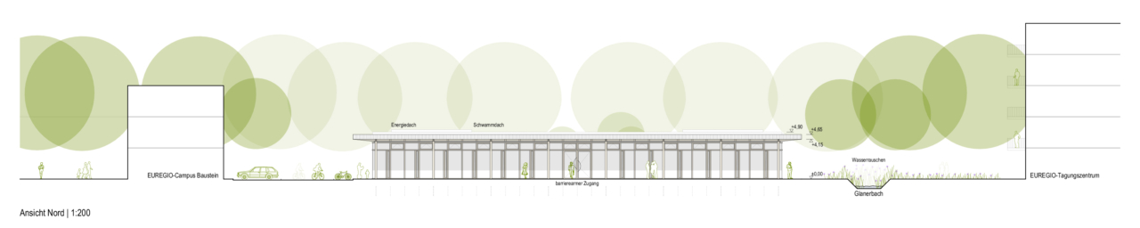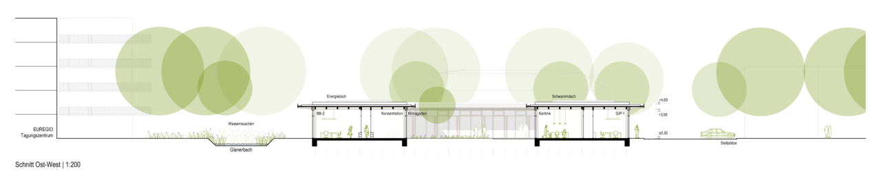 Im Westen ist der Entwurf mit dem bestehenden EUREGIO-Tagungszentrum verbunden, während im Osten Platz für zukünftige Büro- und Gewerbeflächen vorgesehen ist.