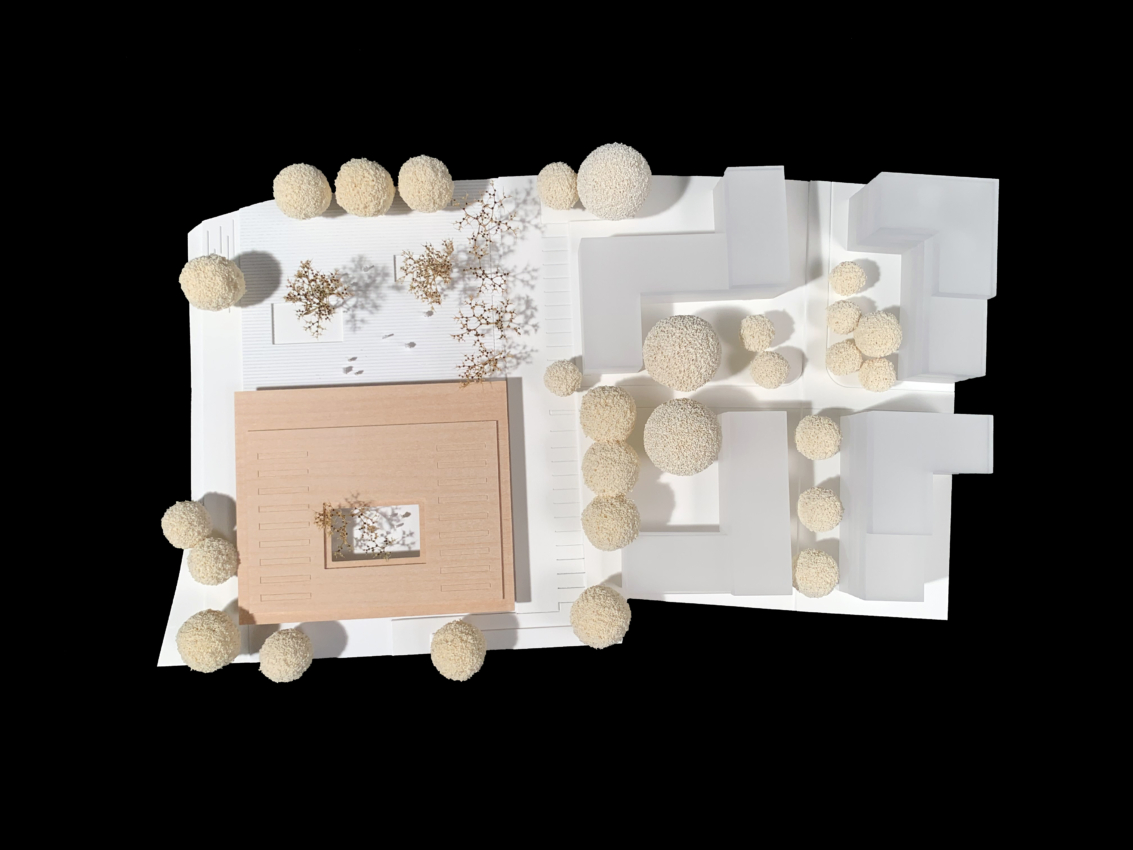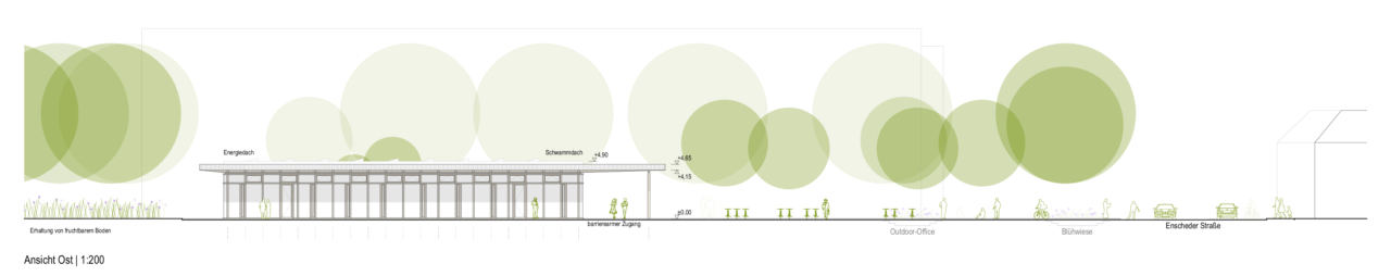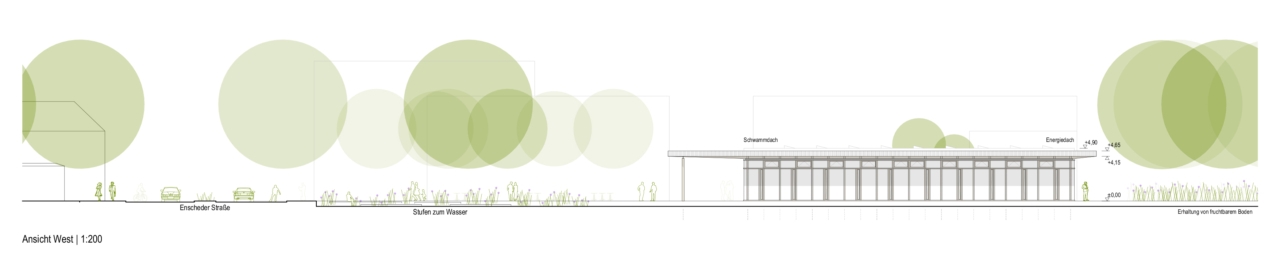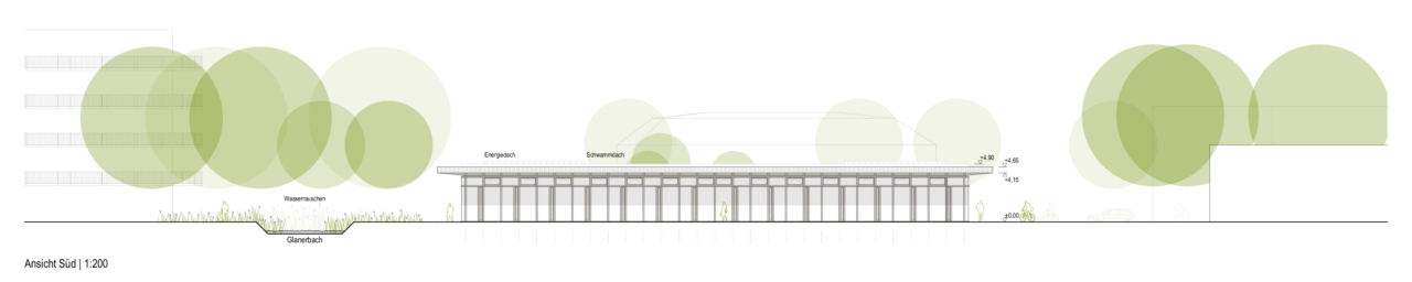 Der Wettbewerbsentwurf setzt auf eine Hybridbauweise mit einem hohen Holzanteil. Ergänzt durch Gründächer, Solarenergie und ein durchdachtes Belüftungskonzept wird eine umweltfreundliche und energieeffiziente Nutzung ermöglicht.