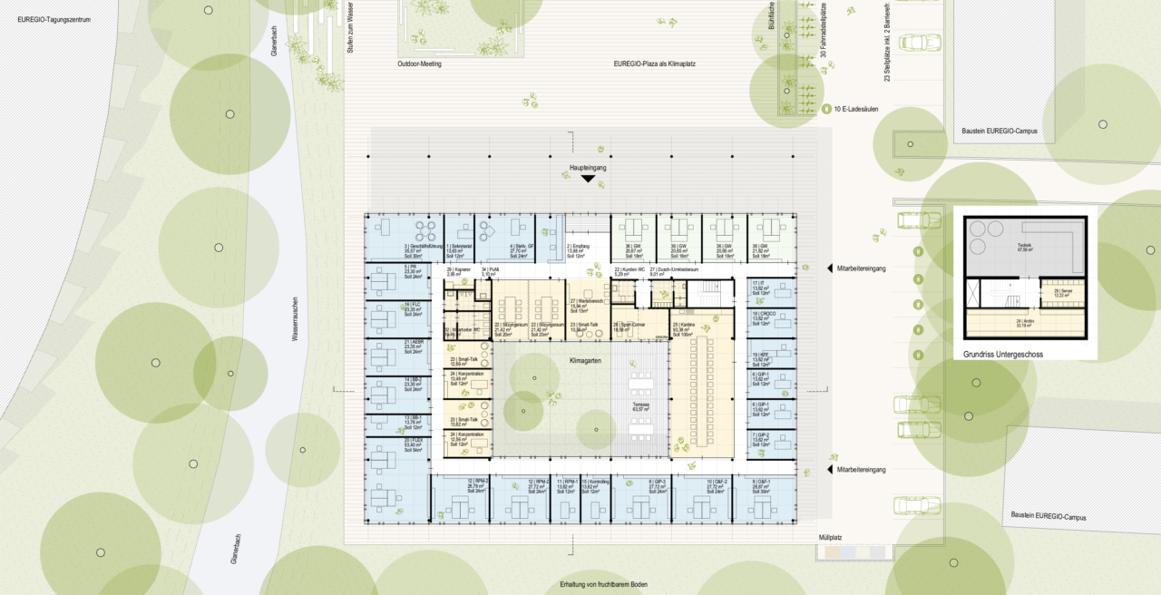 Das Gebäude organisiert sich um einen begrünten Innenhof, der sowohl als Rückzugsort als auch als Treffpunkt dient. Transparente Fassaden und offene Sichtachsen fördern Orientierung und Begegnung. Der Entwurf bietet außenorientierte Büros im äußeren Ring, Gemeinschaftsbereiche und Ruhezonen wie Mensa, Terrasse uns Stillarbeitsräume im inneren Ring. Eine barrierefreie Planung und die Erzeugung kurzer Wege machen die Geschäftsstelle nutzerfreundlich.