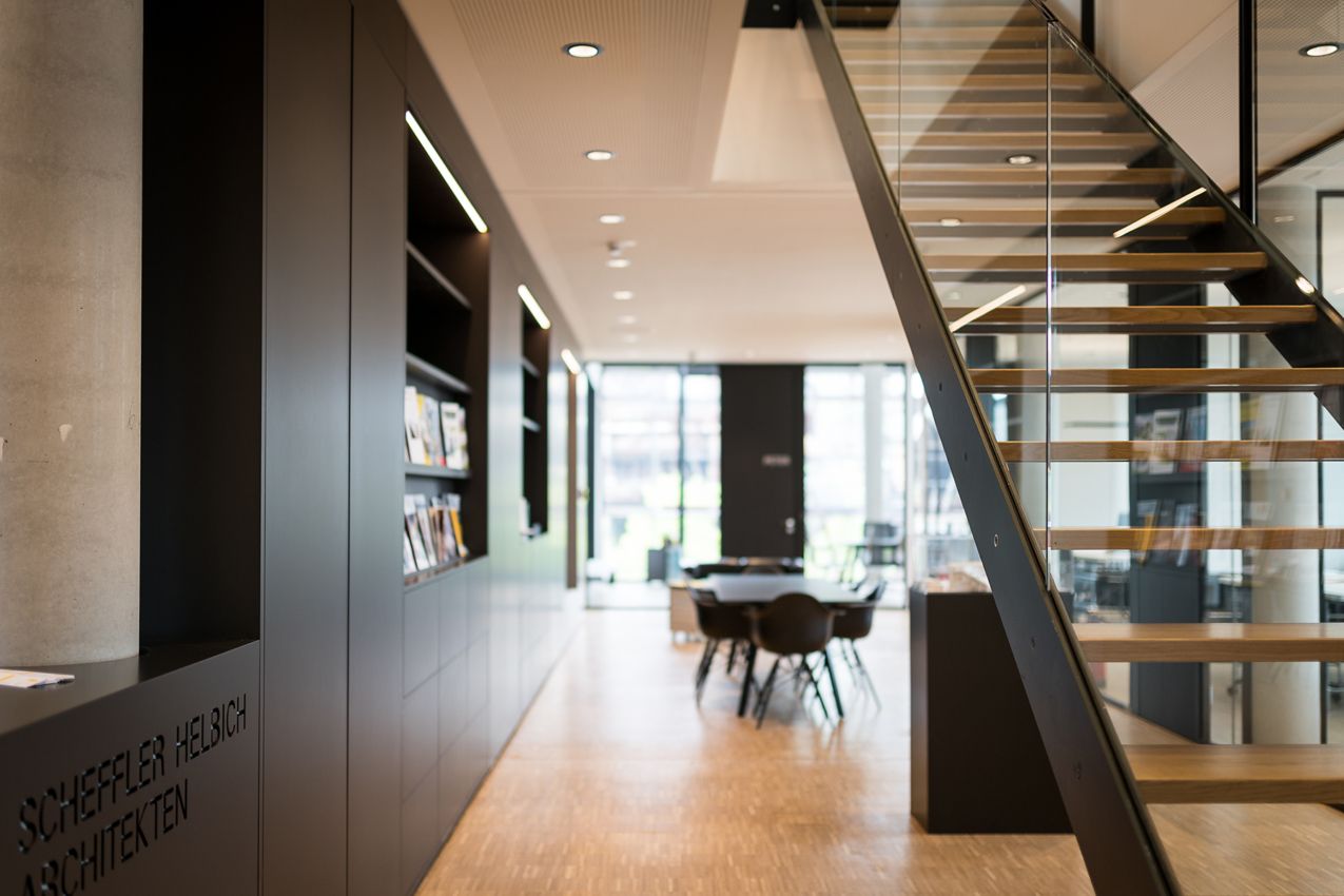 Elektronik: Elektrische Versorgung der Arbeitsplätze über Bodentanks. Arbeitsplatzbeleuchtung mit Rasterfeld- und Einbauleuchten. Treppenhaus- und WC-Beleuchtung wird über Präsenzmelder gesteuert. EDV- und Telefonverkabelung nach mieterseitiger Anforderung.