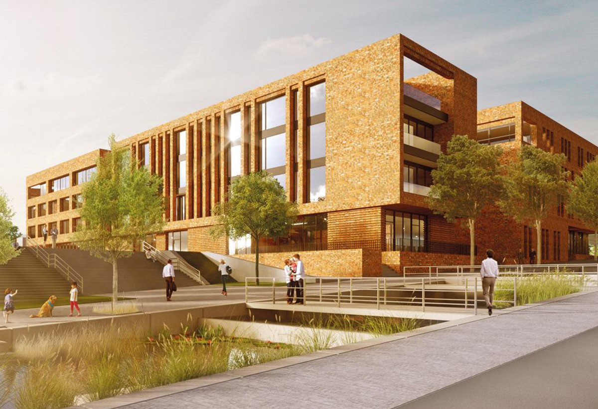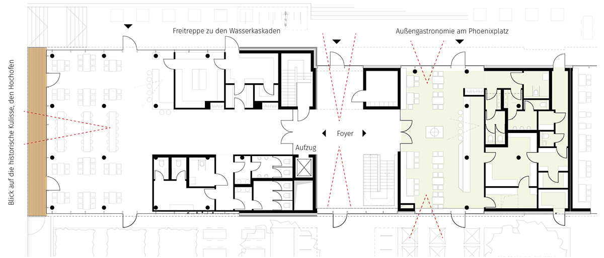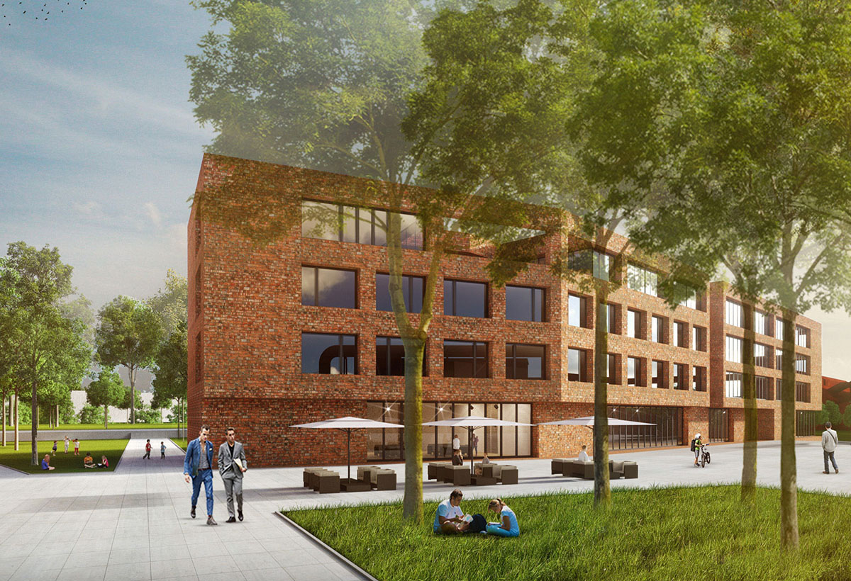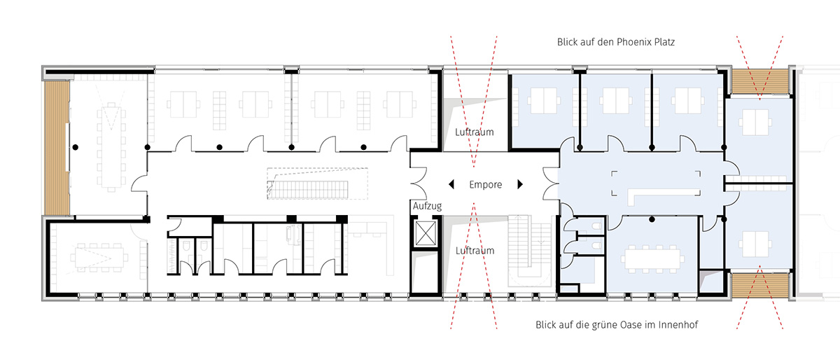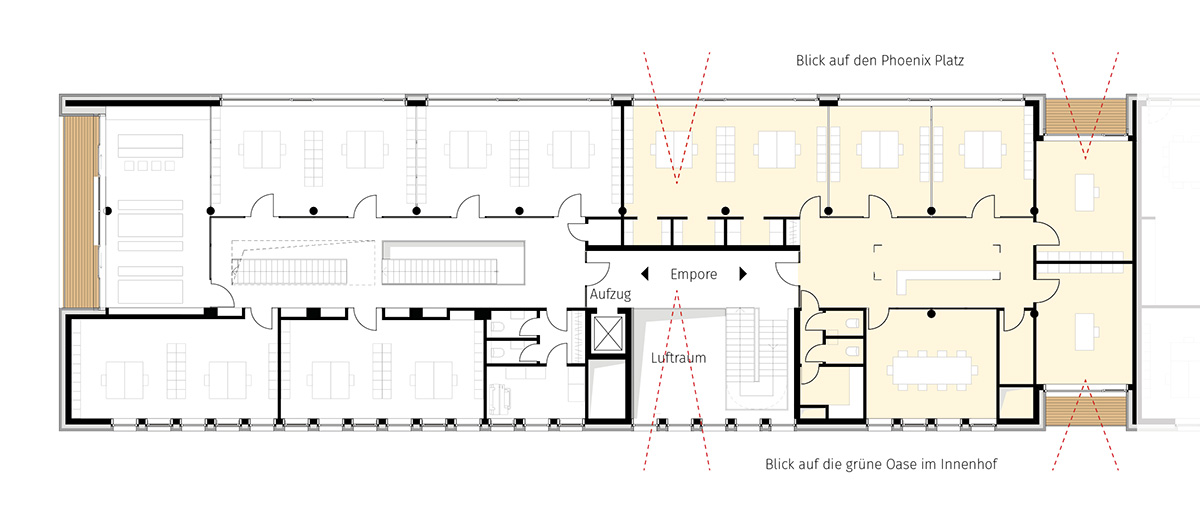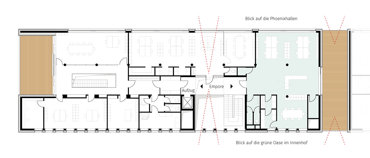 Fassade: Eine charakteristische, hochwertige Klinkerfassade in Anlehnung an den historischen Bestand der Phoenixhalle. Lichtdurchflutete, flexible Raumaufteilung durch die großzügige Fensterfront.