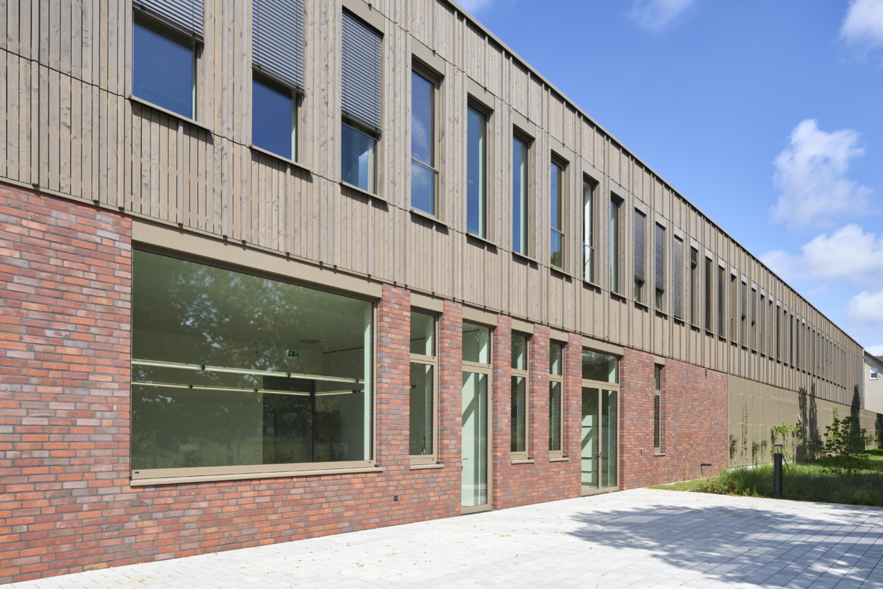 Am neuen Betriebsstandort der Thyssengas GmbH kommt eine Mischbauweise zum Einsatz. Das Erdgeschoss wird von einer massiven Stahlbetonkonstruktion getragen, wo hingegen das Obergeschoss des Verwaltungsgebäudes eine leichte Holzrahmenkonstruktion erhält. Durch einen Wechsel des Fassadenmaterials wird die zweigeteilte Konstruktionsweise auch nach außen hin verdeutlicht, indem das Erdgeschoss mit Klinkersteinen und das Obergeschoss mit einer Lärchenholzverkleidung versehen wird.