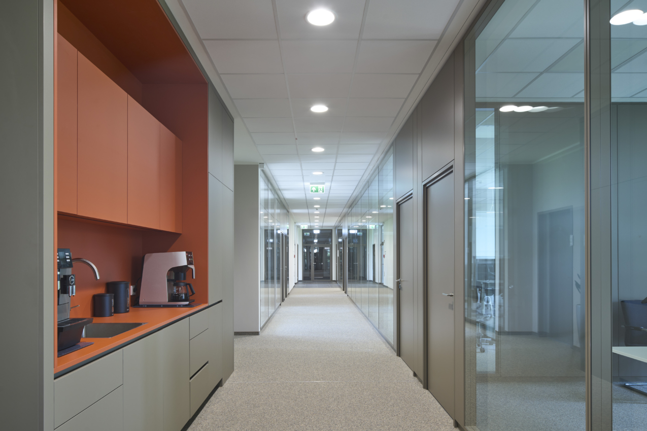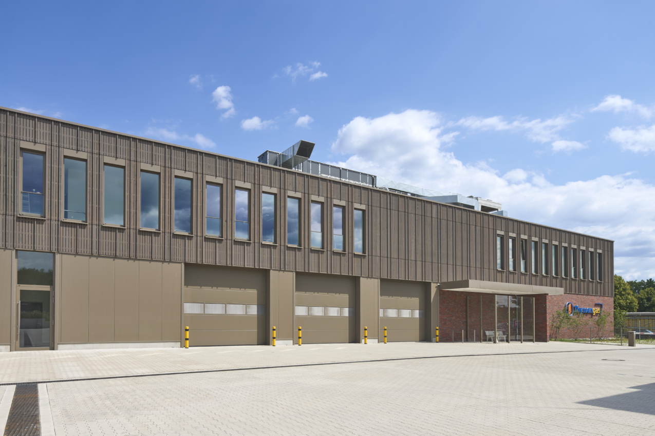 Eine große Ressourcenersparnis entsteht hierbei durch den Einbau der Holzrahmenkonstruktion im Obergeschoss des Verwaltungsbaus, womit der Einsatz von Stahlbeton erheblich gesenkt werden kann. Die Klimatisierung der Betriebsstelle wird durch einen in den Erdboden eingelassenen Eisspeicher sichergestellt, mit dem im Winter die Innenräume emissionslos geheizt und im Sommer gekühlt werden können. Des Weiteren werden neben einer flächendeckenden Photovoltaik-Anlage auf dem Dach auch eine Dach- und Fassadenbegrünung realisiert.