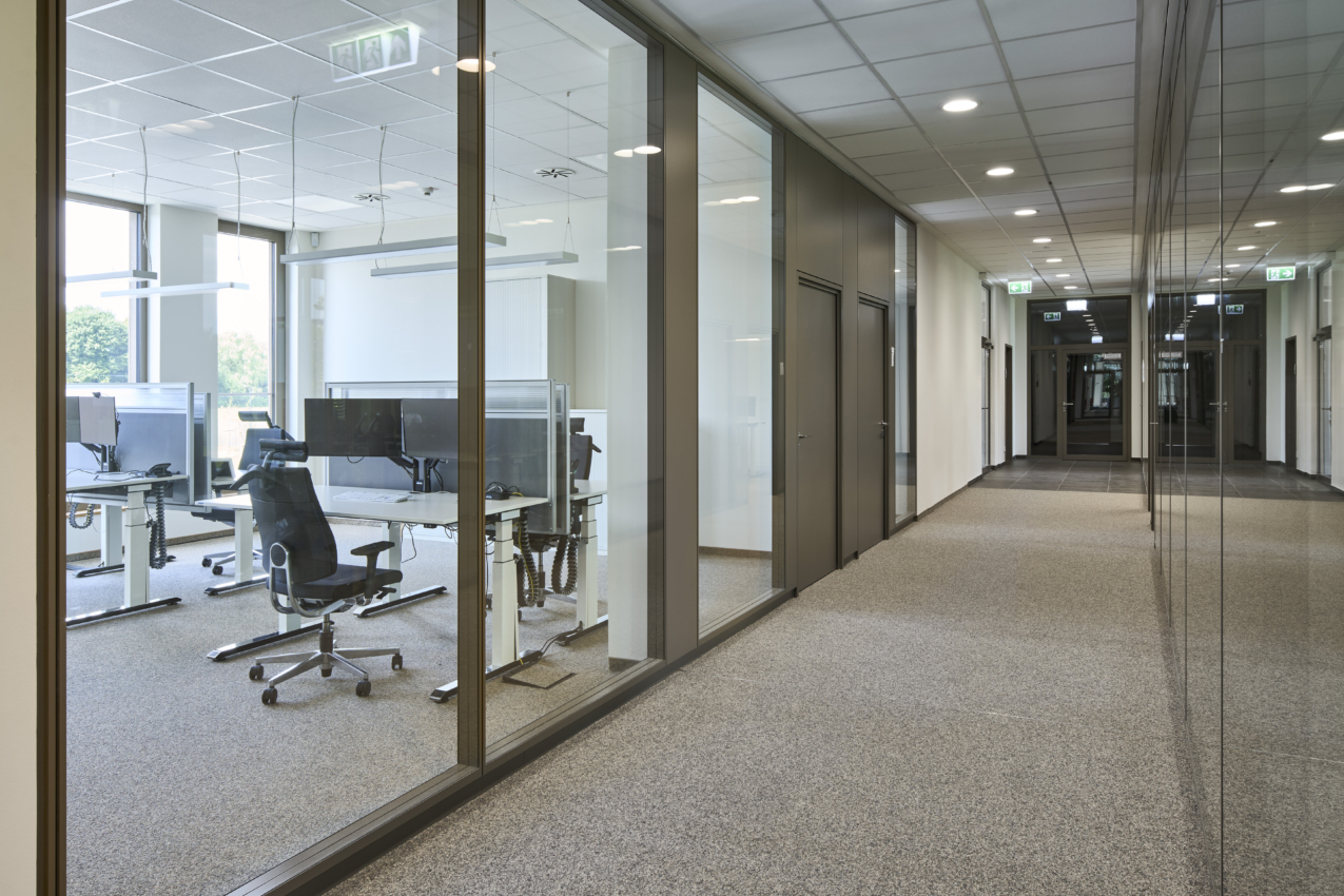 Ein Betriebshof mitsamt Mitarbeiterstellplätzen und einem Rohrlager sowie großzügig angelegte Grünflächen vervollständigen das insgesamt 7.500 m² große Gelände des Verwaltungsstandorts der Thyssengas GmbH in Recklinghausen.