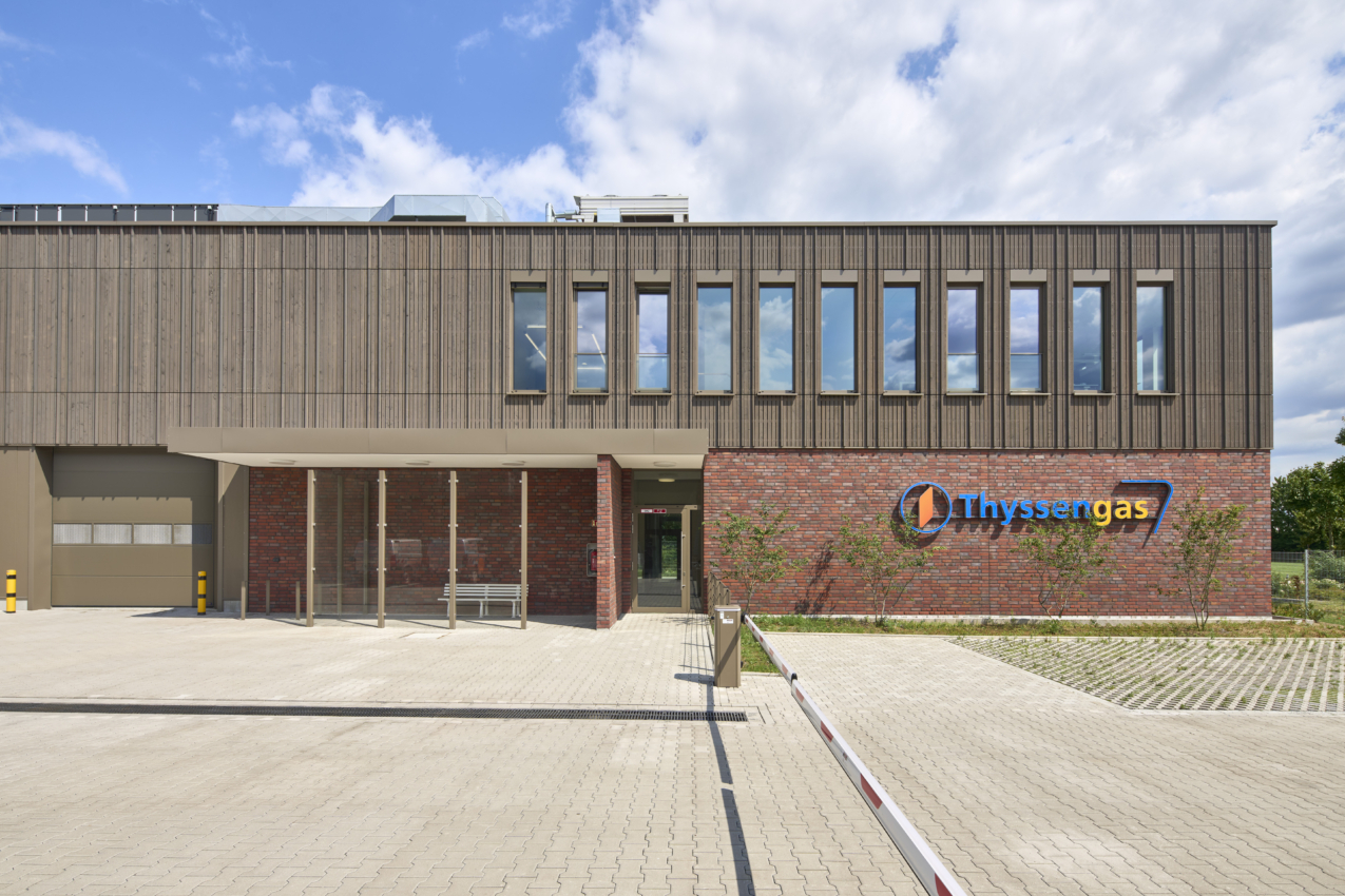 Der Neubau der Betriebsstelle der Thyssengas GmbH ist als zwei unabhängige Baukörper konzipiert. Ein zweigeschossiger Riegel dient als Verwaltungsgebäude und bietet im Erdgeschoss ausreichend Garagenfläche für das Abstellen von Betriebsfahrzeugen. Ergänzt wird der Verwaltungsbau von einem ebenfalls zweigeschossigen Lagergebäude mit genug Platz für Werkstätten und Lagerfläche.