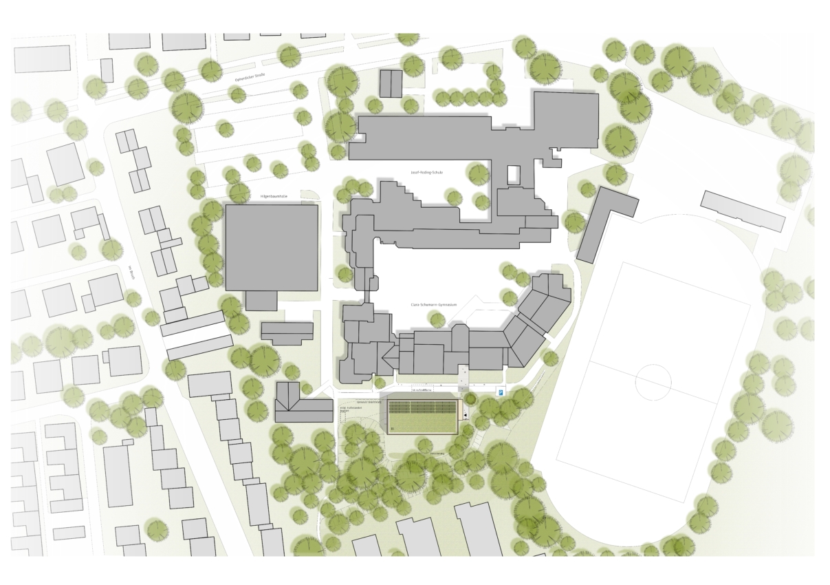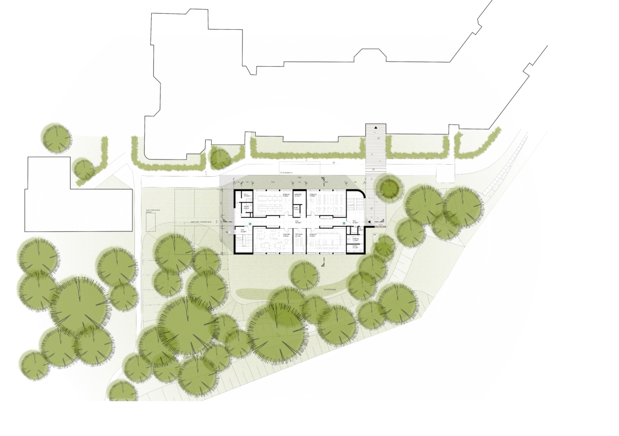 Die Anbindung an den Bestand erfolgt über den südlichen Eingang der zentralen Halle. Von hier führt ein gestalterisch gefasster Weg zum neuen Haupteingang, der durch einen vorgelagerten Platz mit Sitzgelegenheiten ergänzt wird.