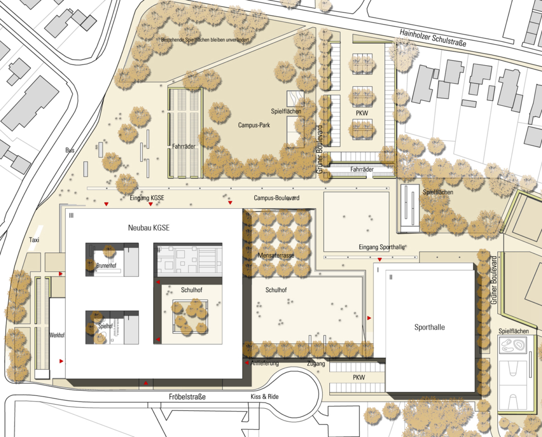 Zudem bringt dieser die Chance, den bisher heterogenen und von wenig Aufenthaltsqualität geprägten Freiräumen im Stadtteil Hainholz eine neue Mitte zu geben und das Schulgebäude in Verbindung mit einem einladenden Schulcampus als öffentliches Stadtteilzentrum zu inszenieren.
