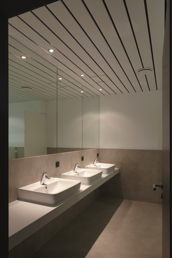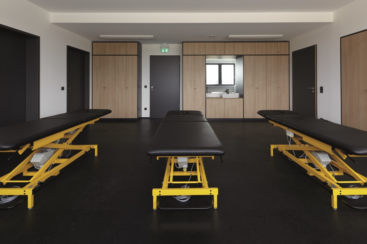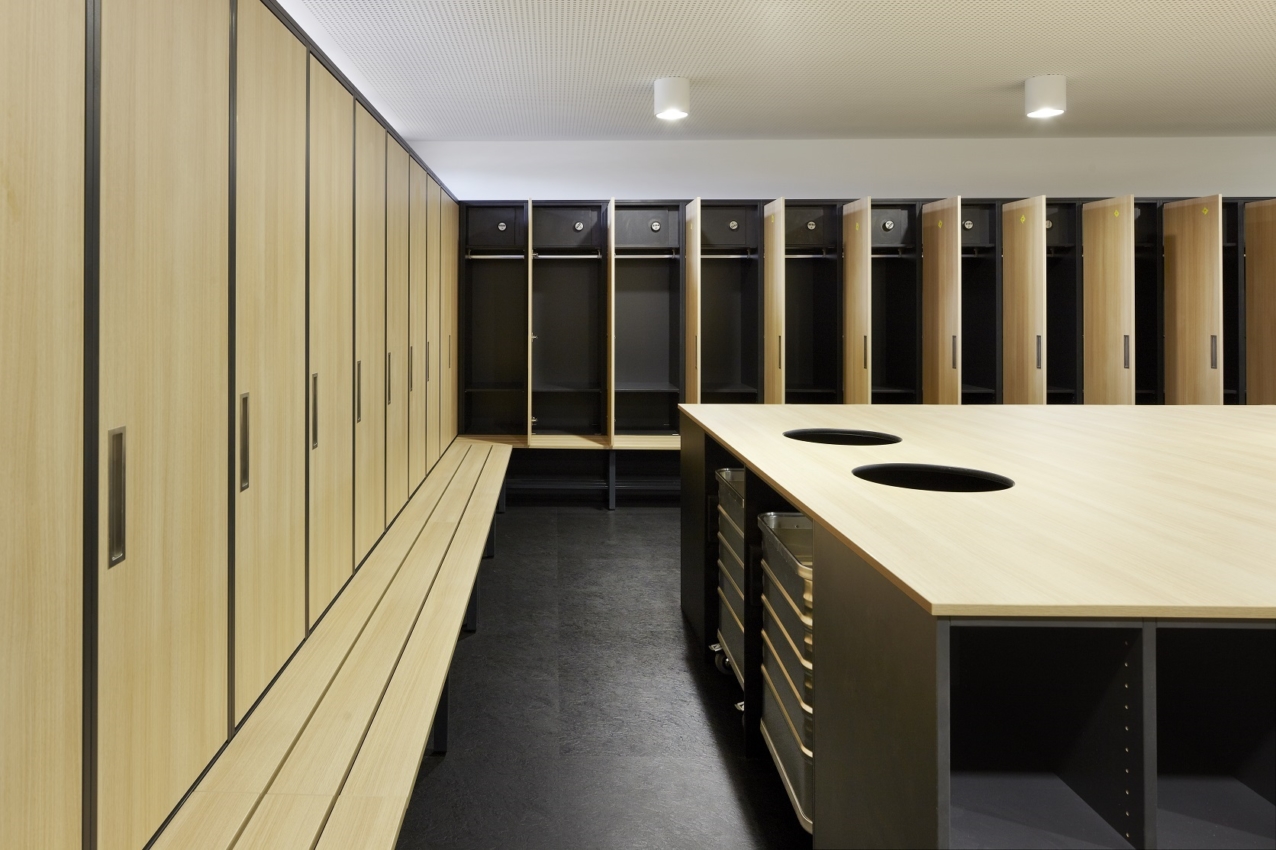 Insgesamt gliedern sich die ca. 1.000m² Nutzfläche in den beiden Etagen in Sportler- und Aufenthaltsbereiche. Im Erdgeschoss sind die Umkleidekabine der Spieler, die Massage- und medizinischen Bereiche sowie die Sauna und Entspannungszonen zu einer abgeschlossenen funktionalen Einheit zusammengefasst. Diese werden von den dienenden Funktionen des Zeugwarts flankiert. Ebenfalls im EG befinden sich die Umkleiden der Trainer sowie der zweigeschossige Kraft- und Fitnessraum mit separatem Auswertungsraum.