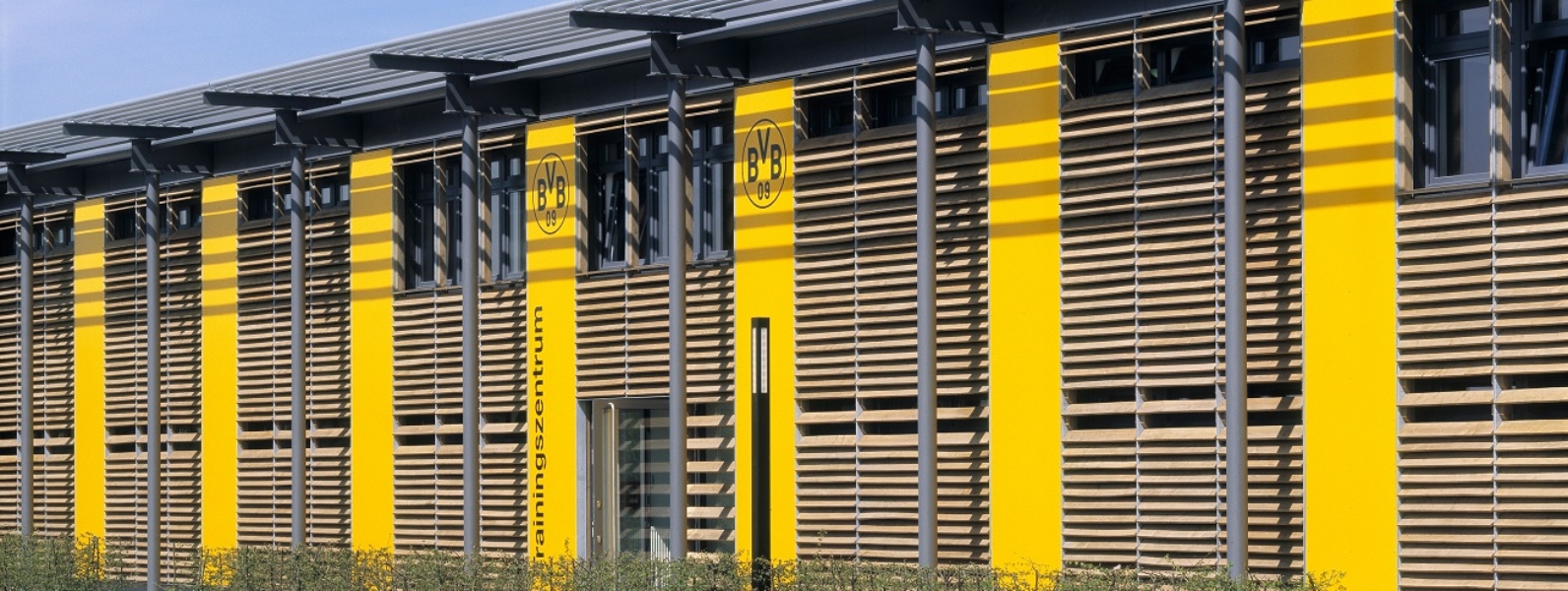 Die Fassade ist in ihrer Oberflächenbehandlung vergleichbar einer Holzhütte, wie man sie aus den Alpen kennt, absolut wartungsfrei. Als Reminiszenz an Fahnen des Vereins nehmen auf der Südfassade große gelbe Tafeln diese Farbe des BVB auf und stärken den Duktus der Fassade zusätzlich.